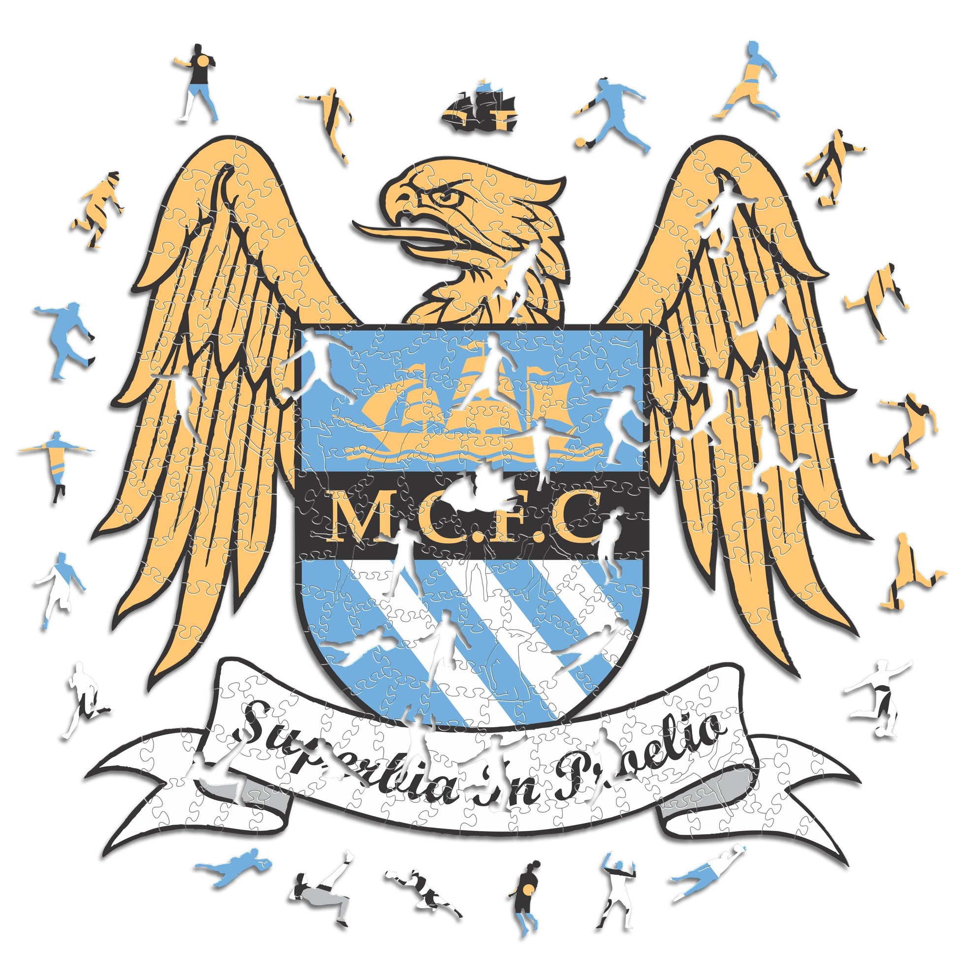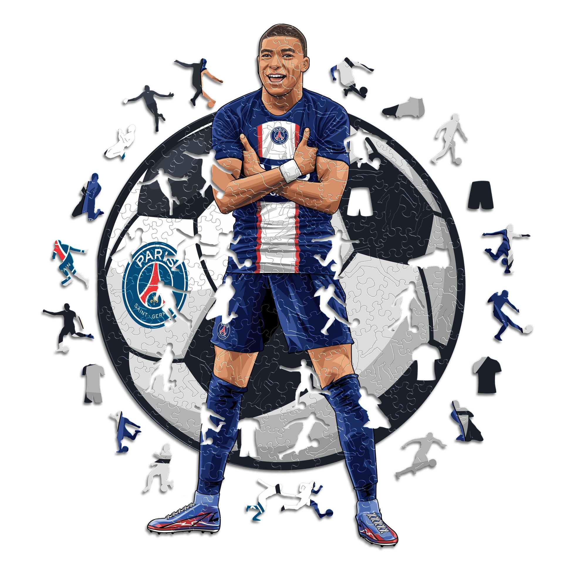 ✓ Each puzzle piece has a unique shape that depicts elements related to soccer and iconic player poses.