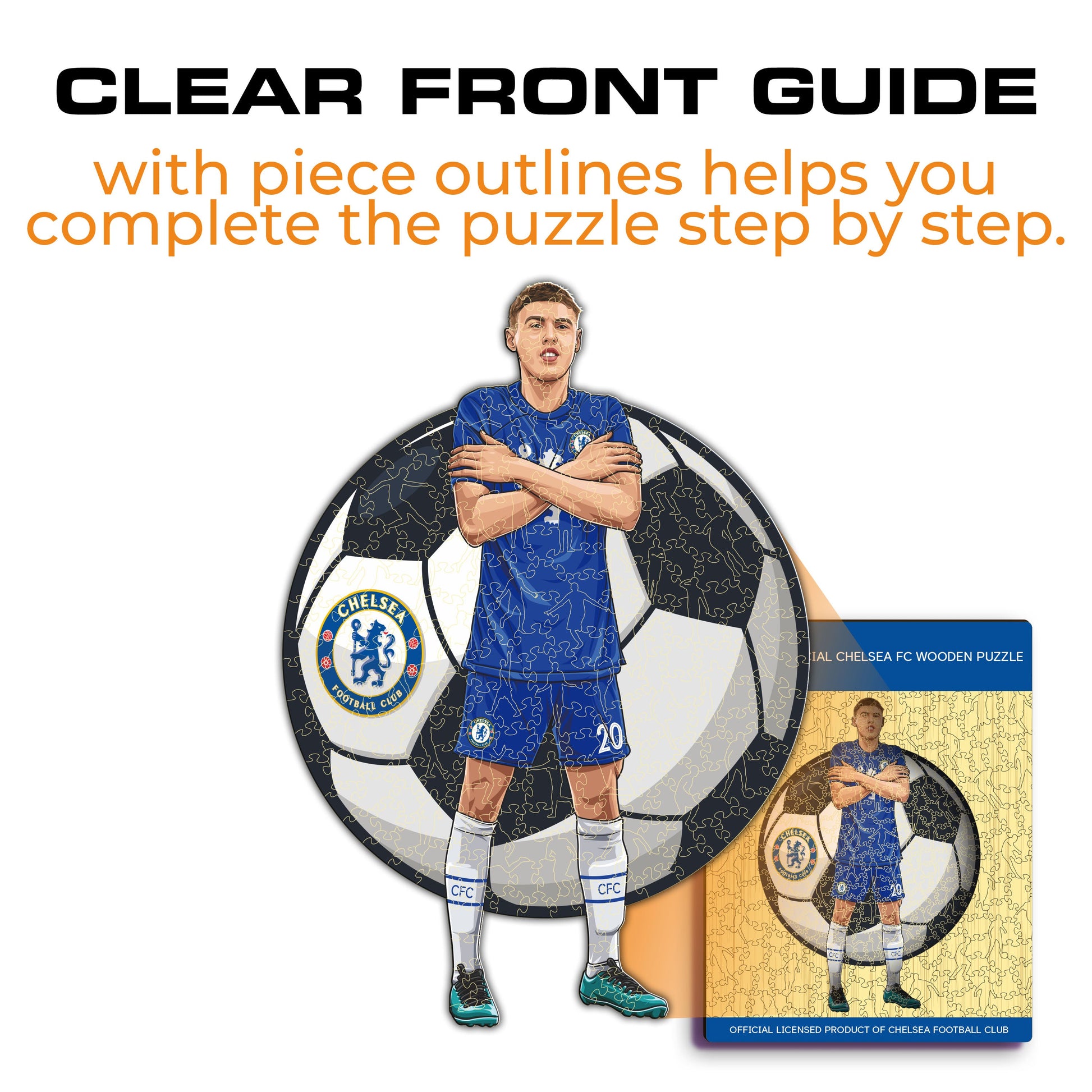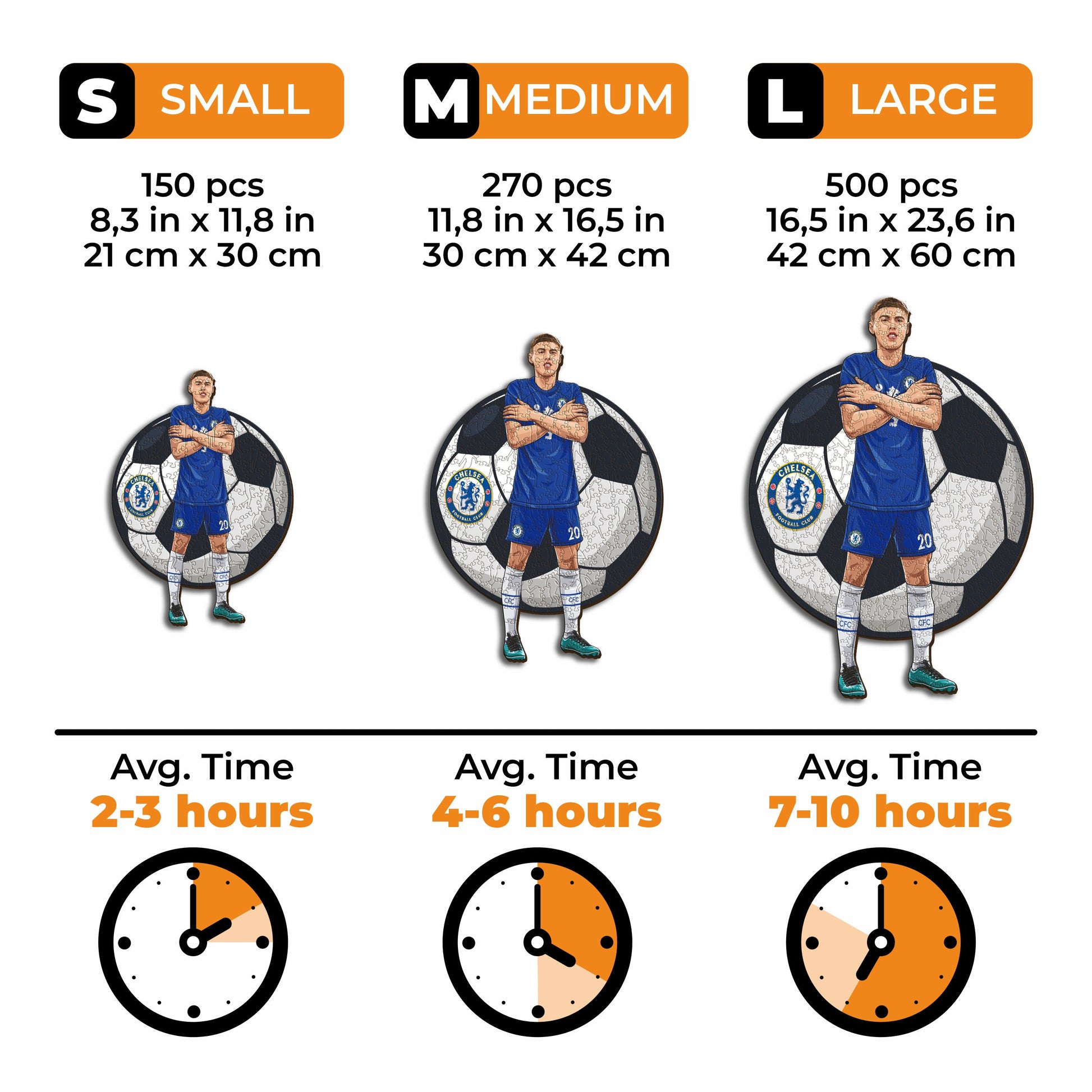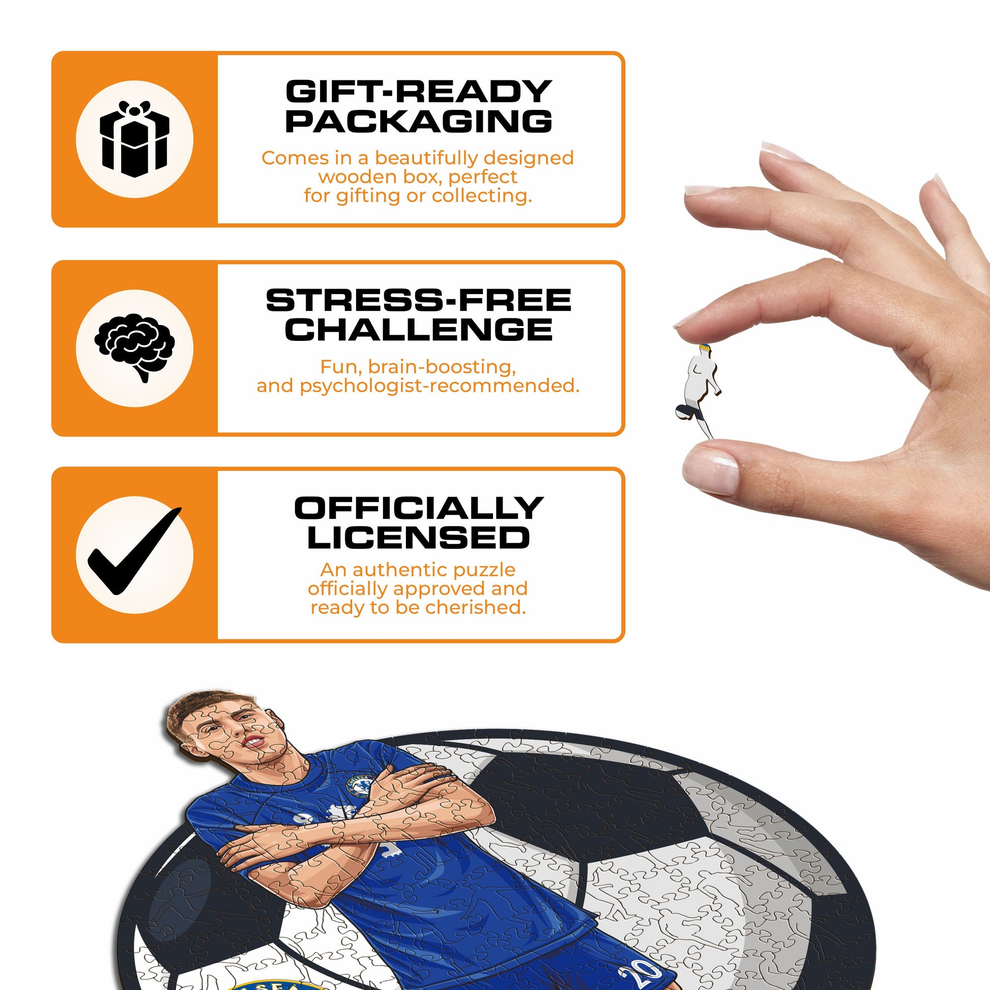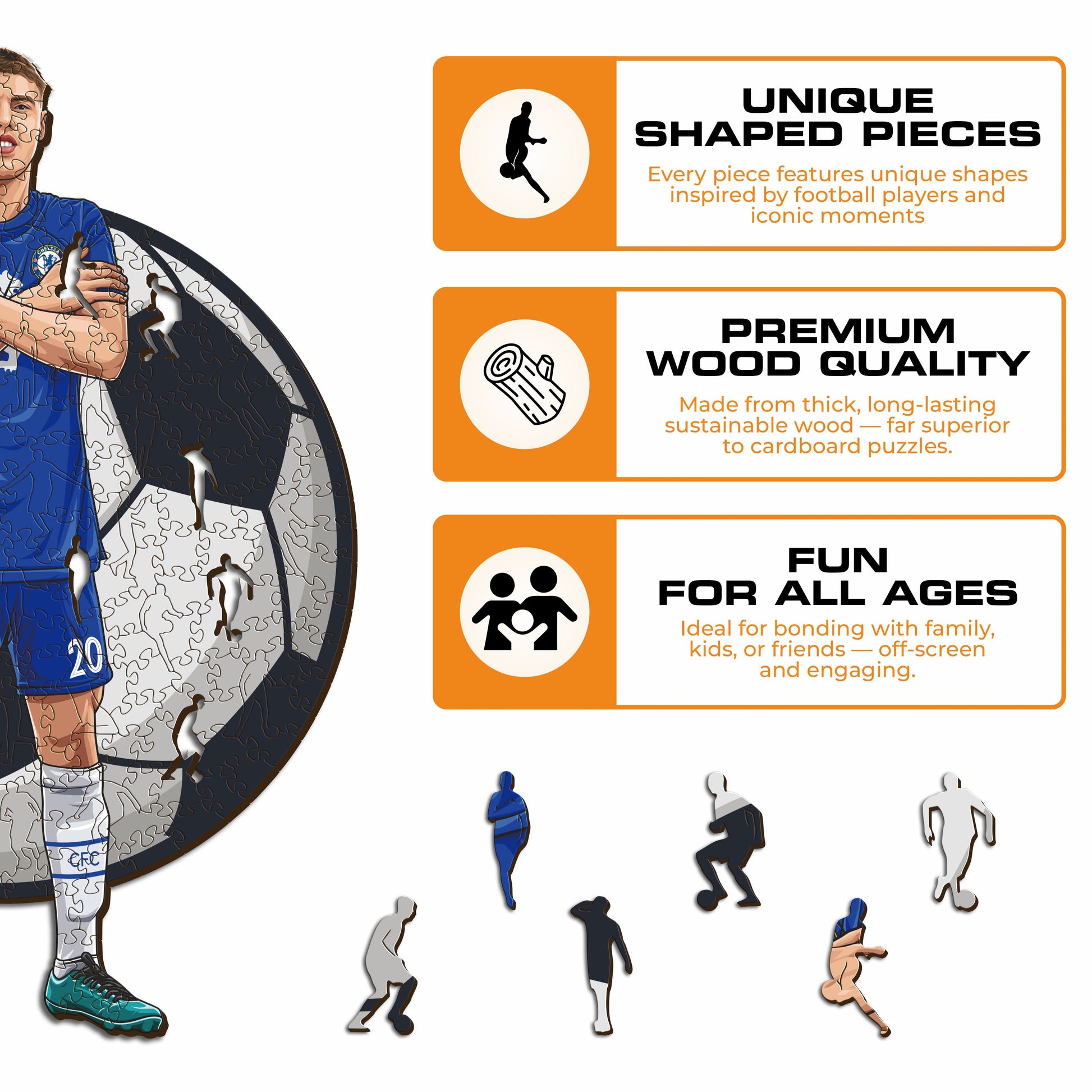 Each puzzle piece has a unique shape that depicts elements related to soccer and iconic player poses.