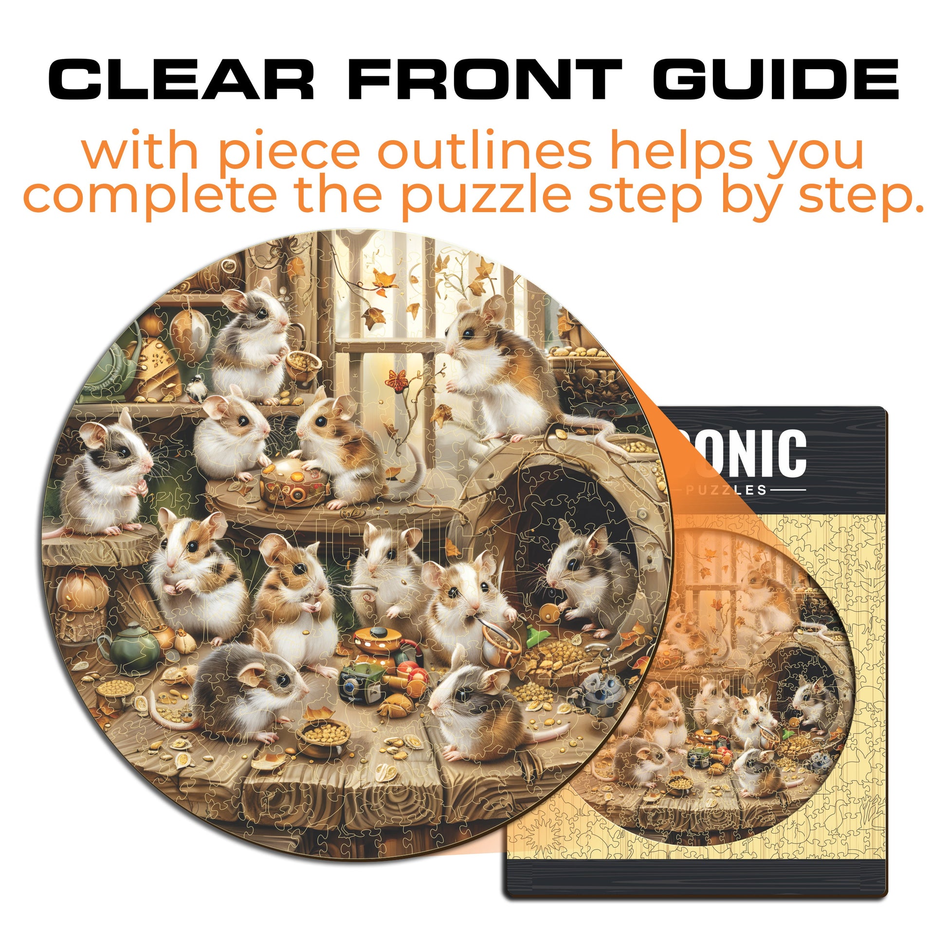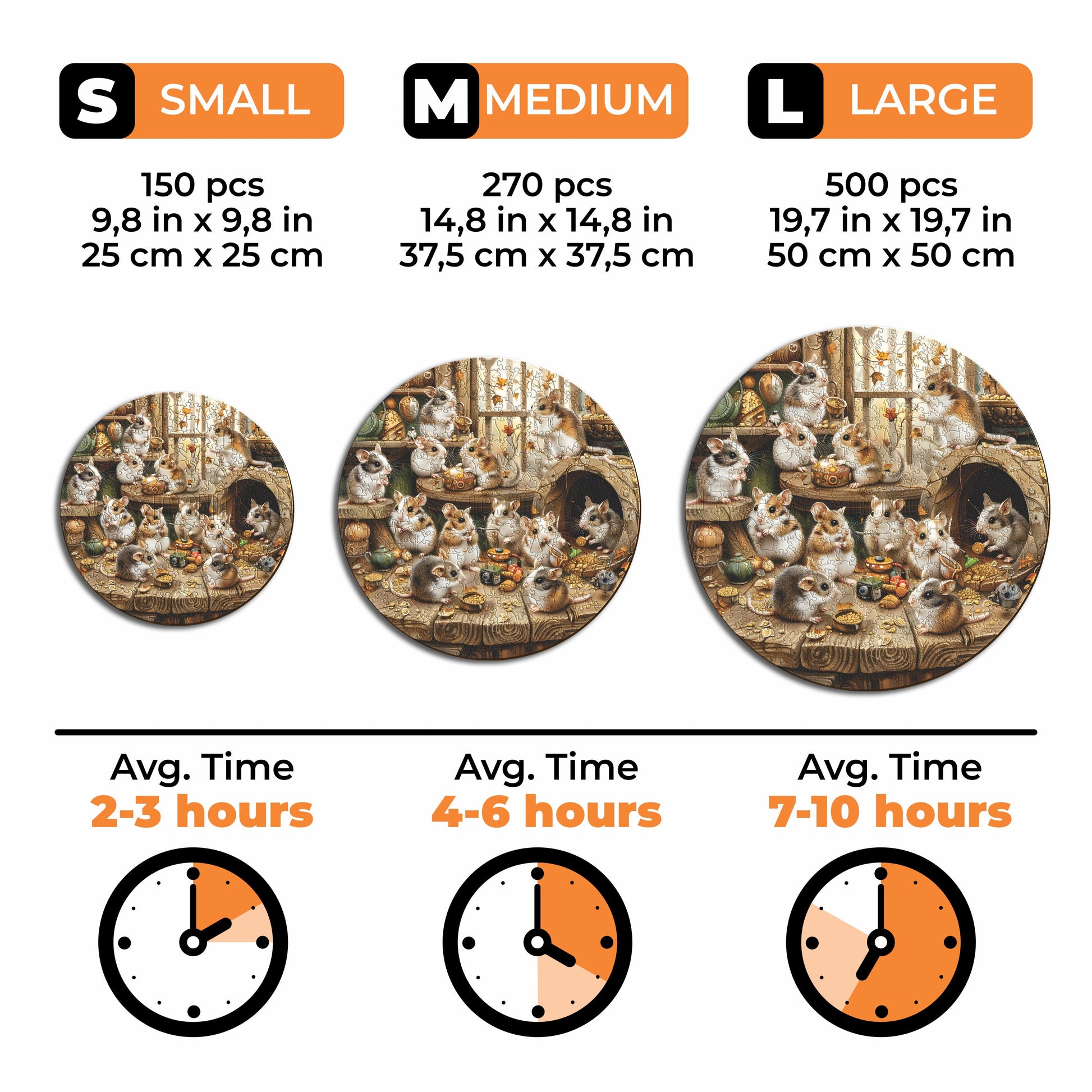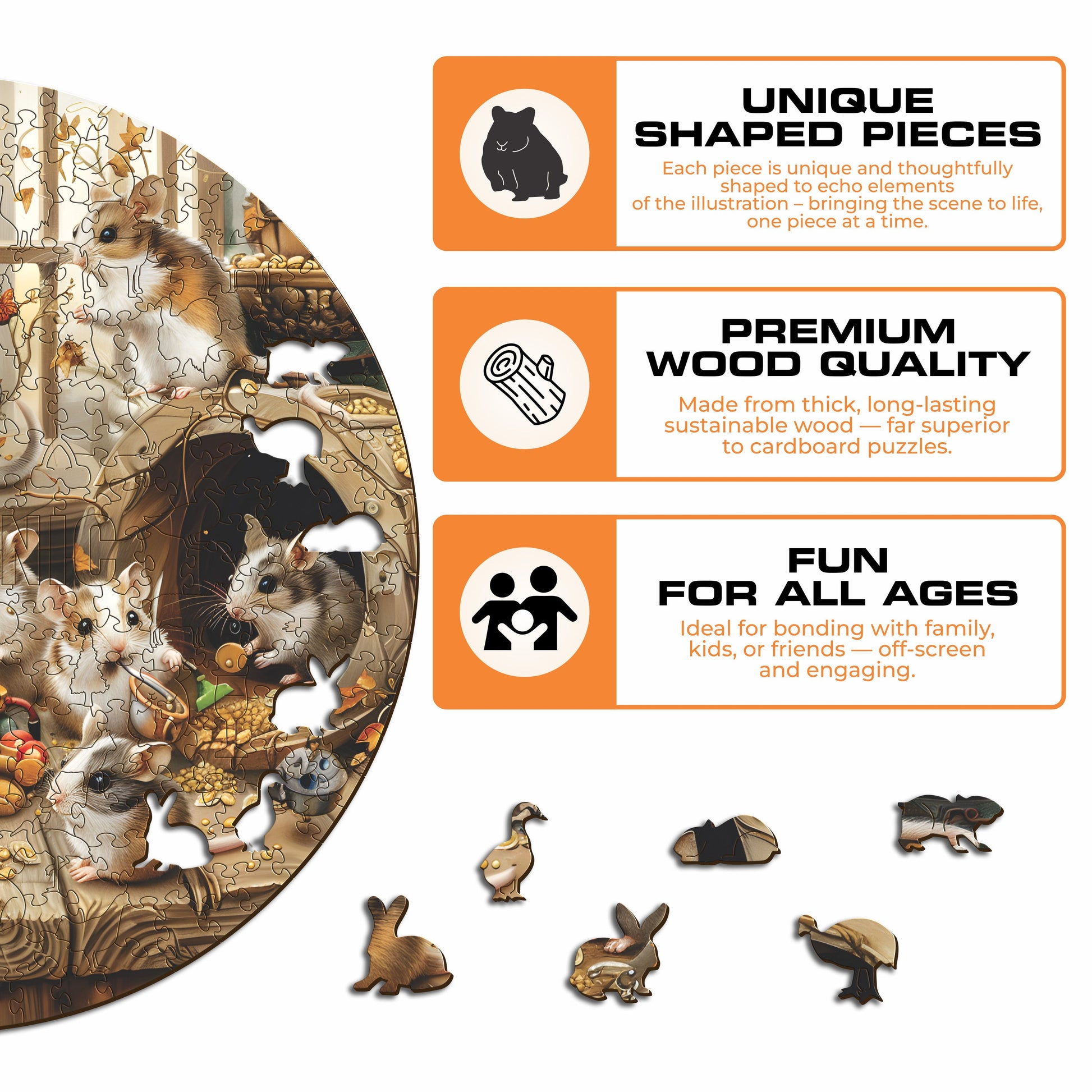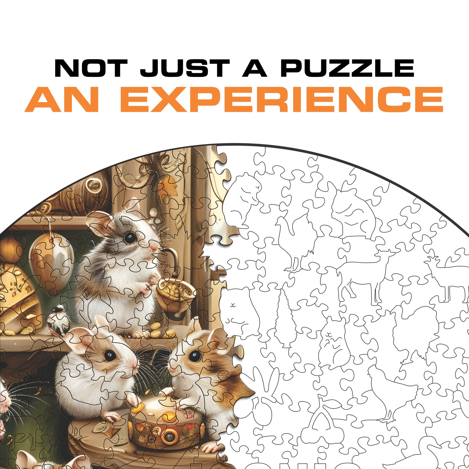 Each puzzle piece has a unique shape that depicts elements related to hamsters.