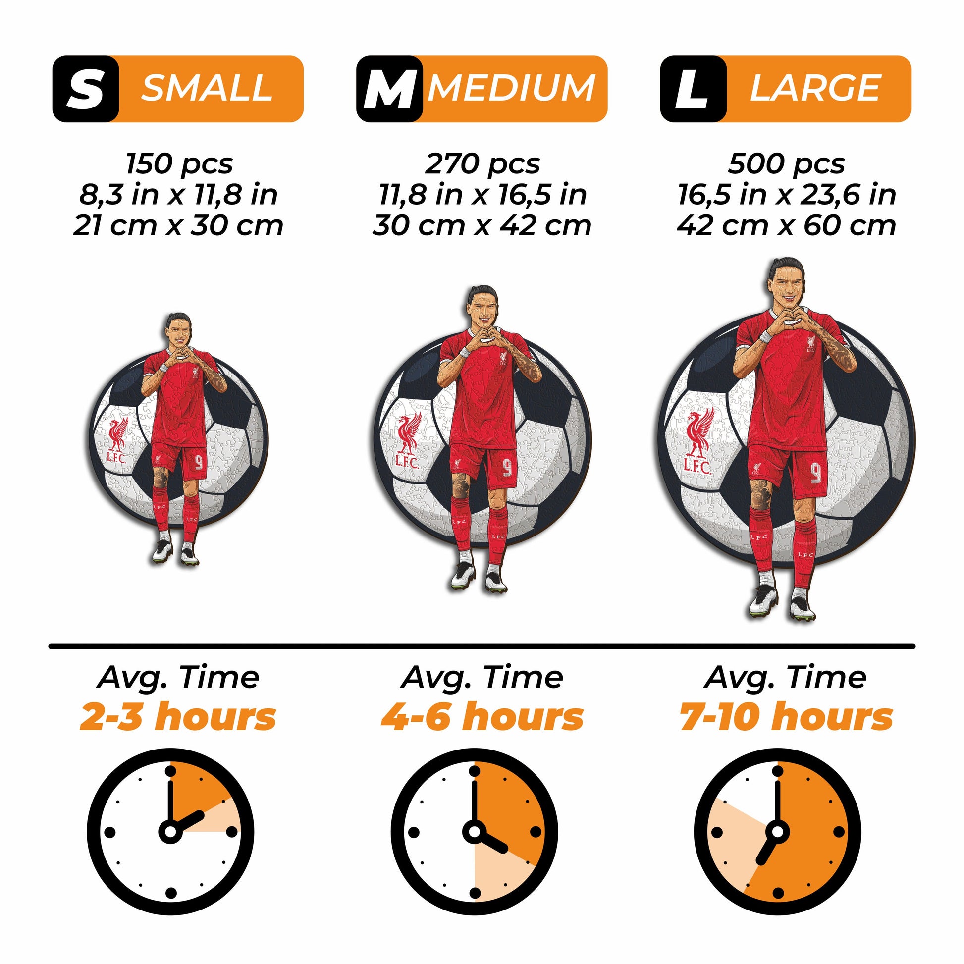 Each puzzle piece has a unique shape that depicts elements related to soccer and iconic players' poses.