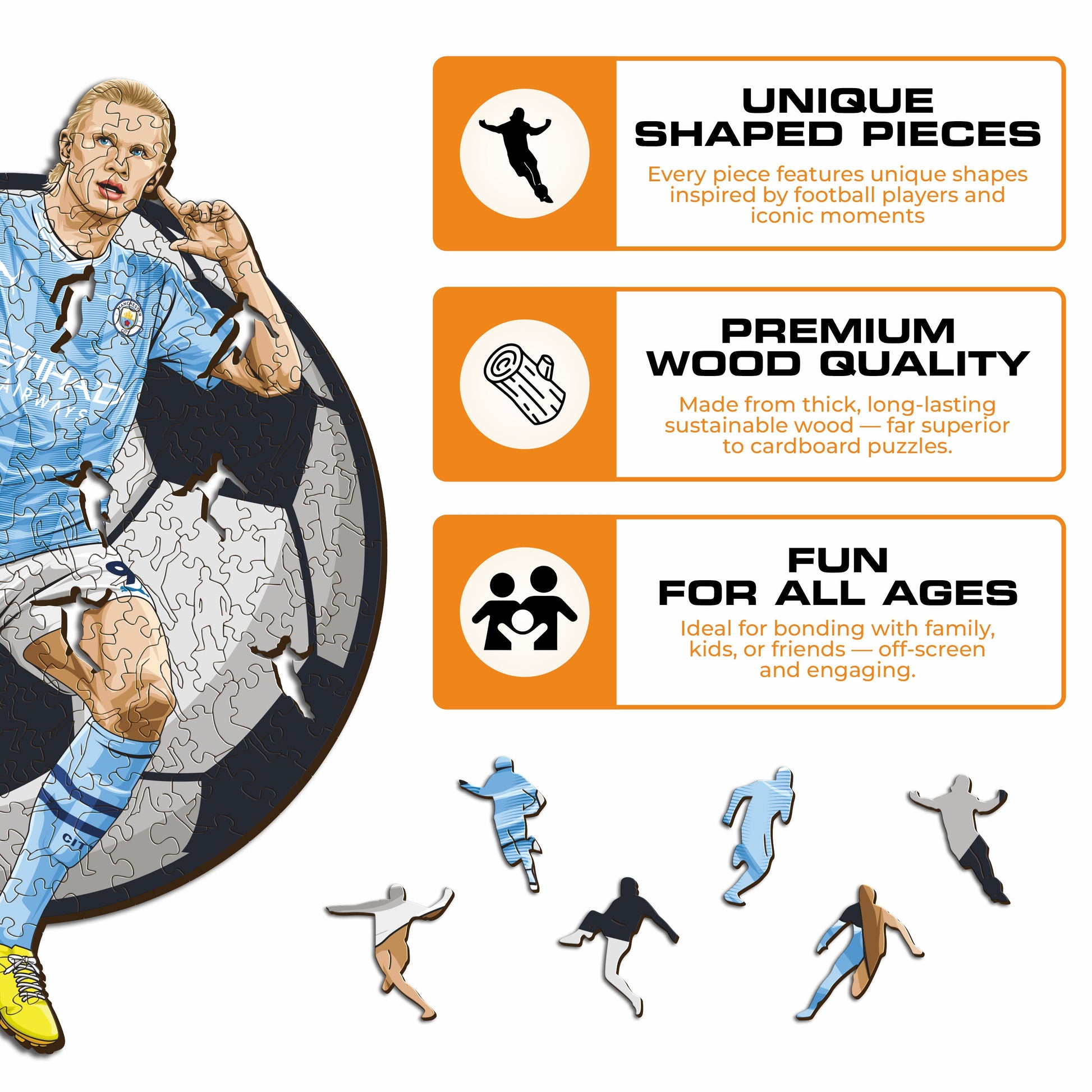 Each puzzle piece has a unique shape that depicts elements related to soccer and iconic players' poses.