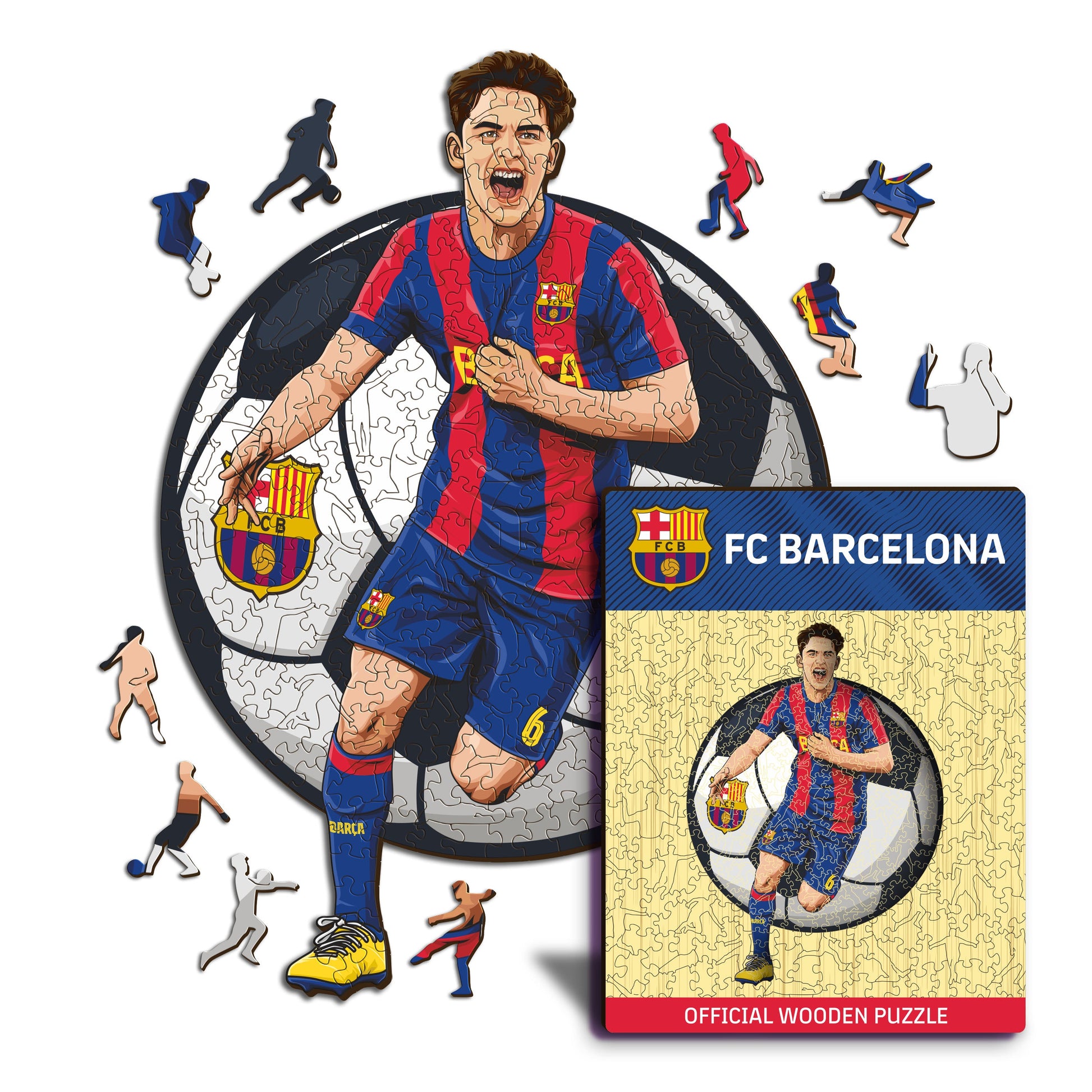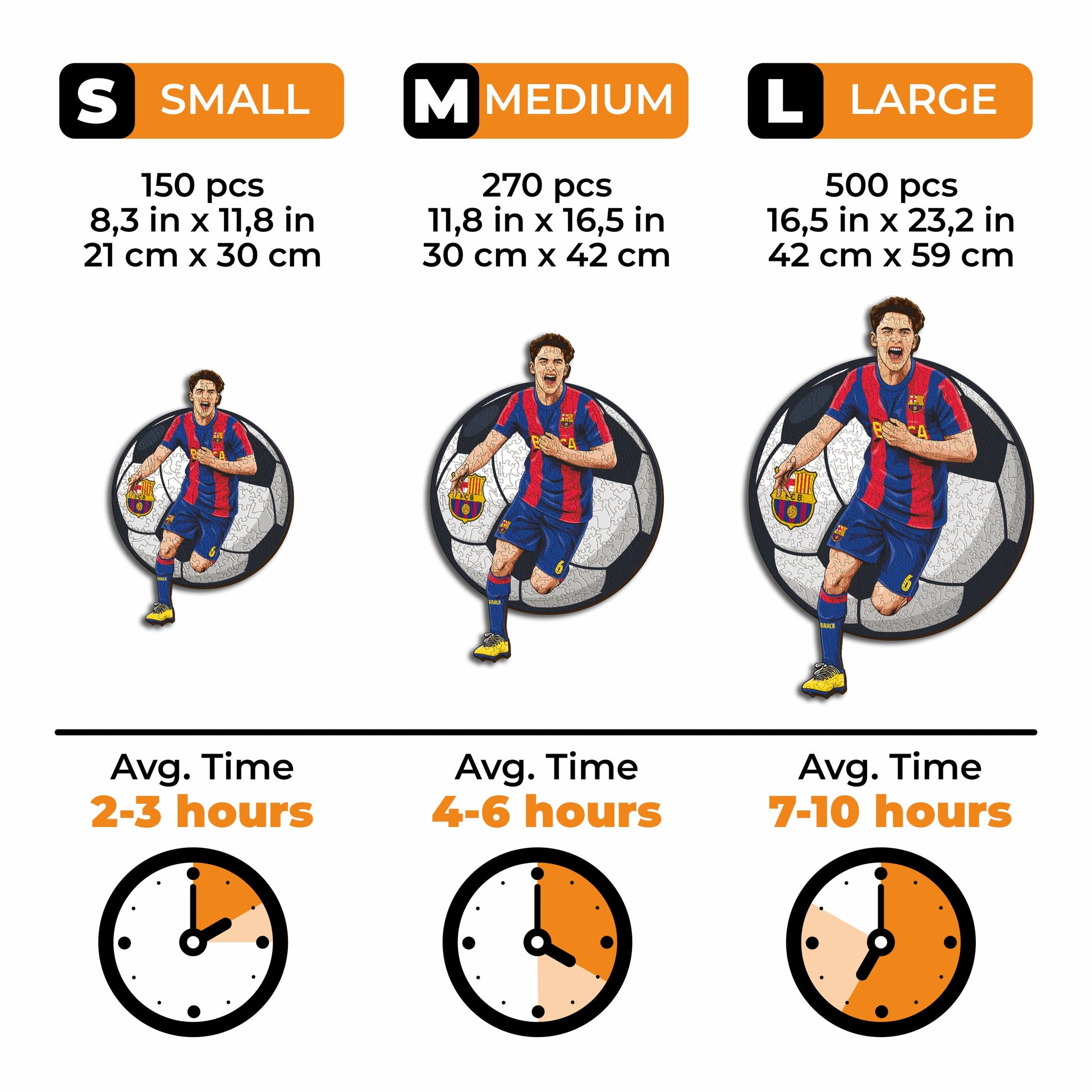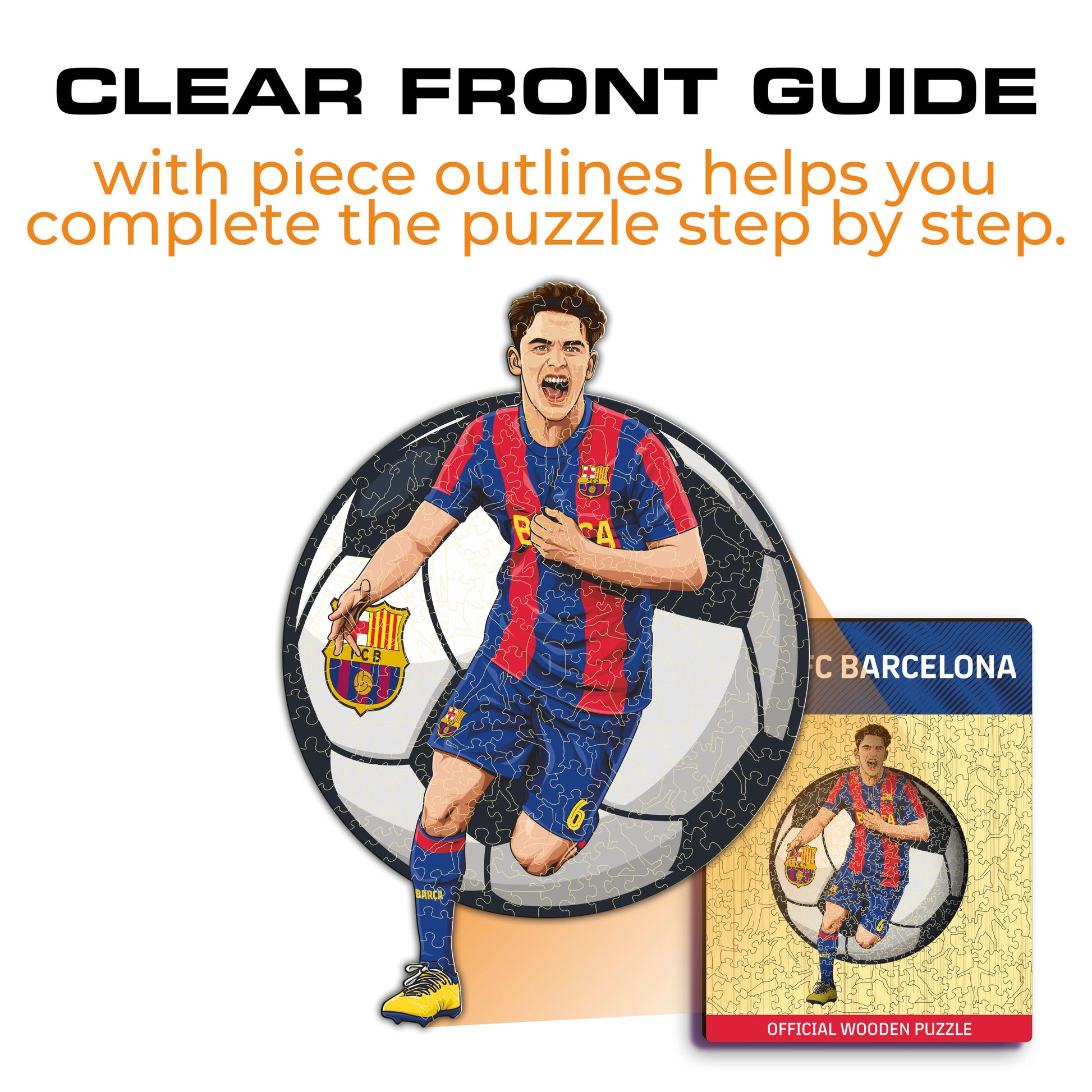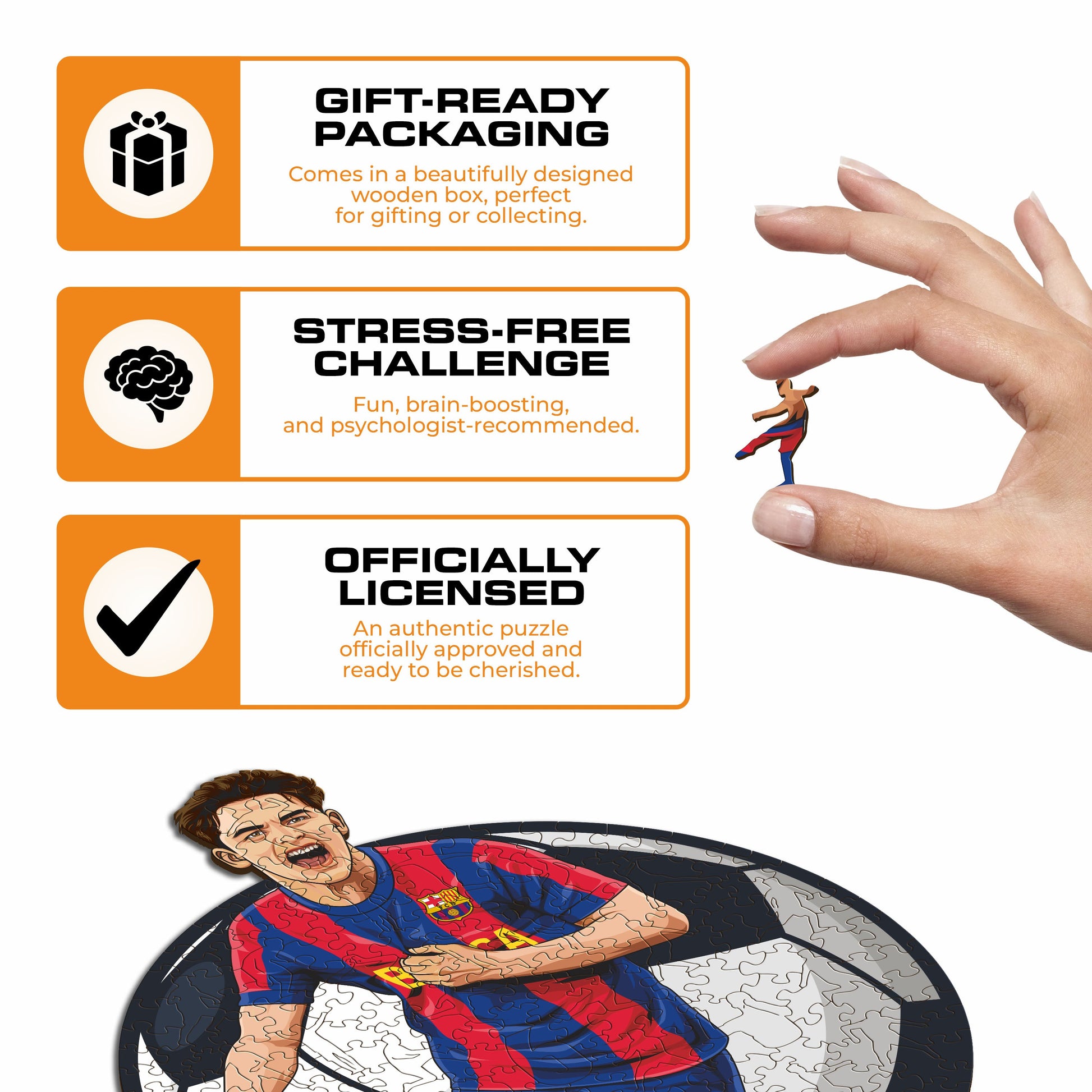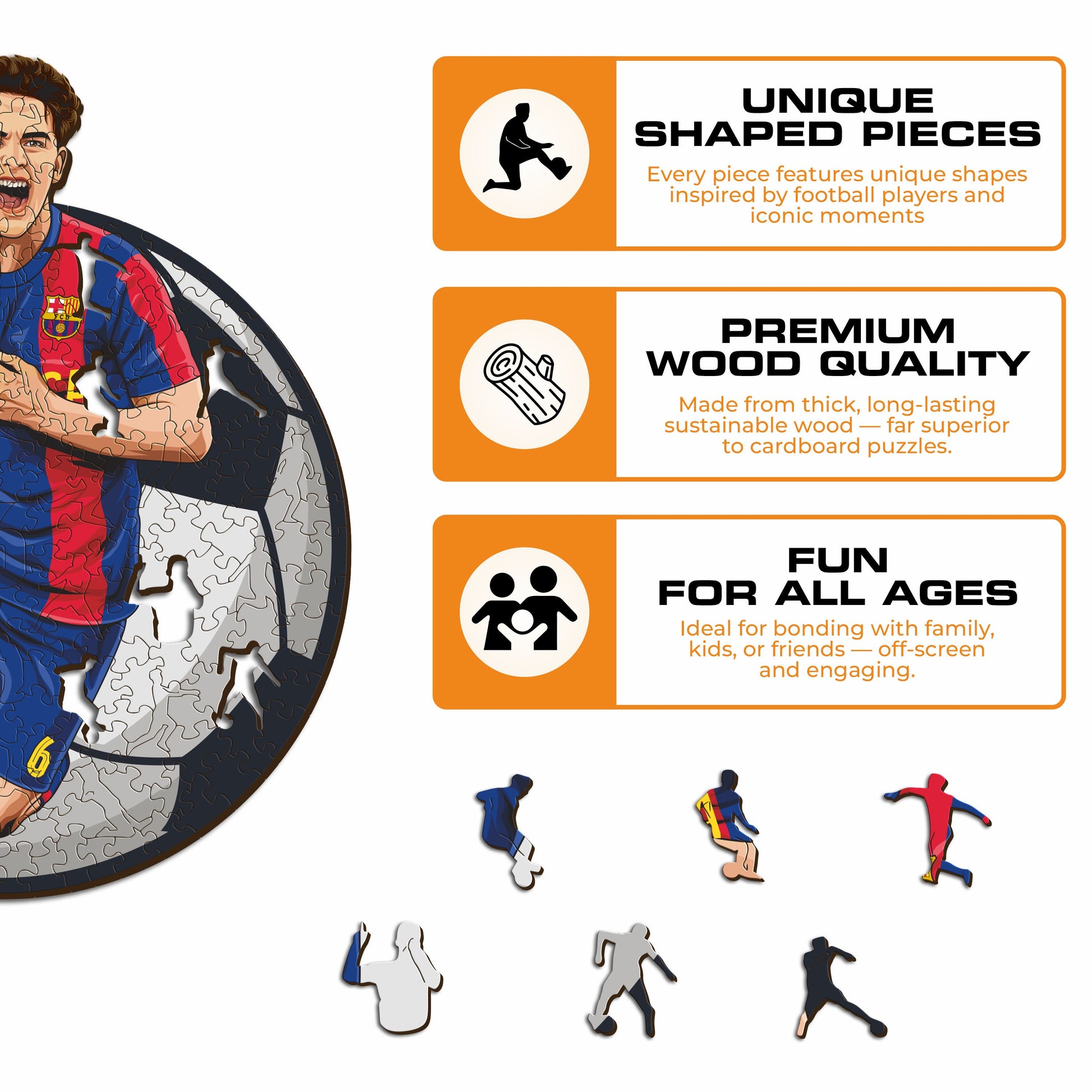 Each puzzle piece has a unique shape that depicts elements related to soccer and iconic player poses.