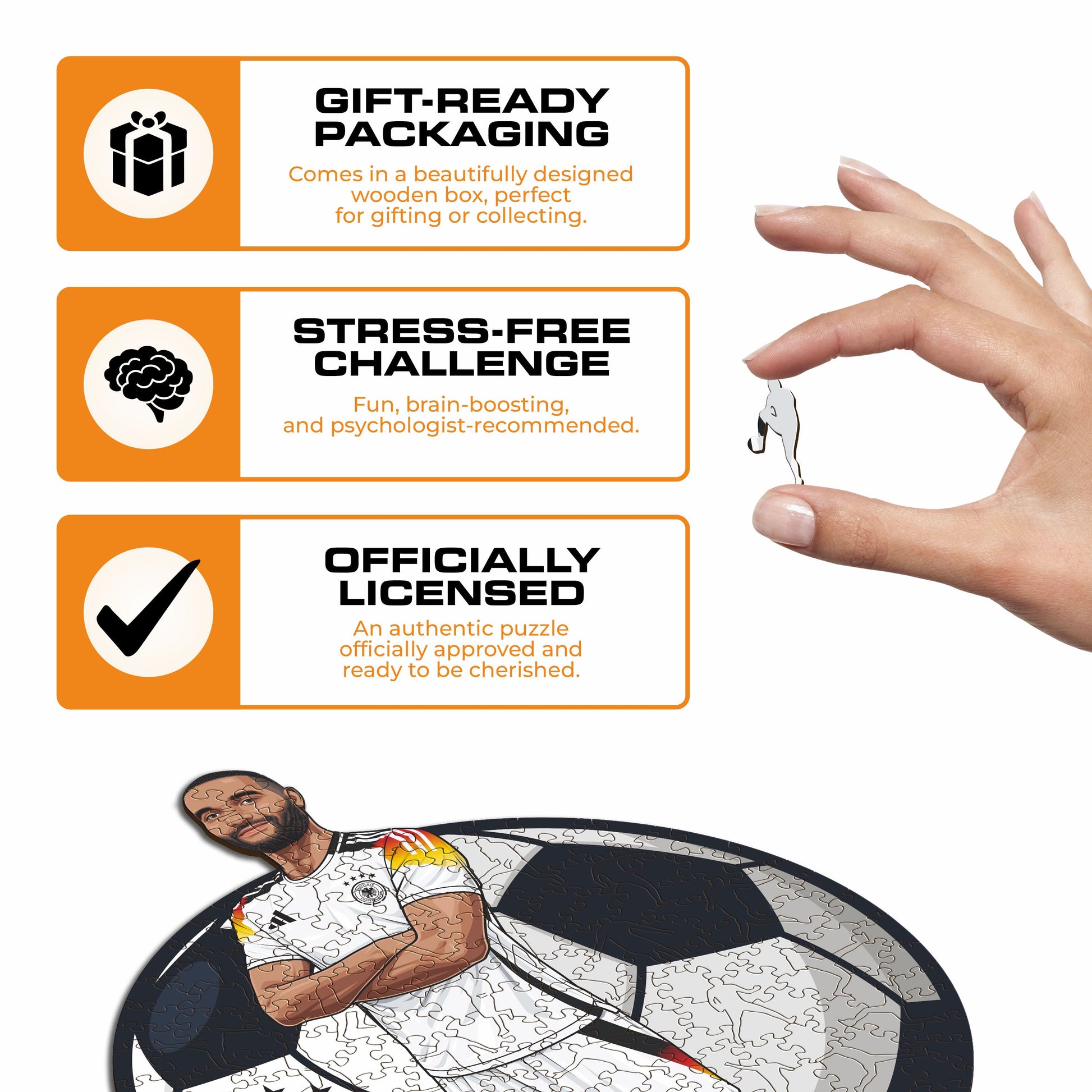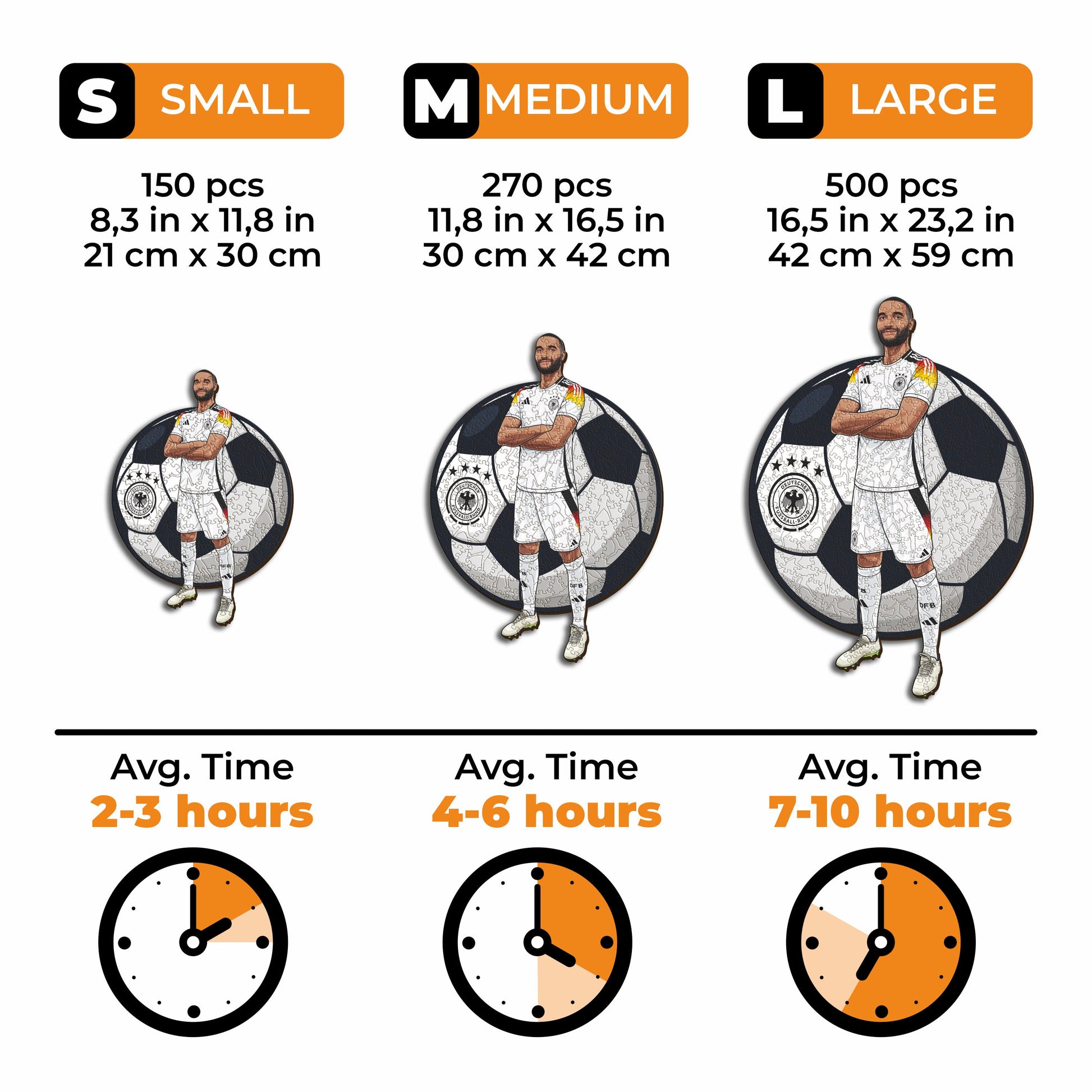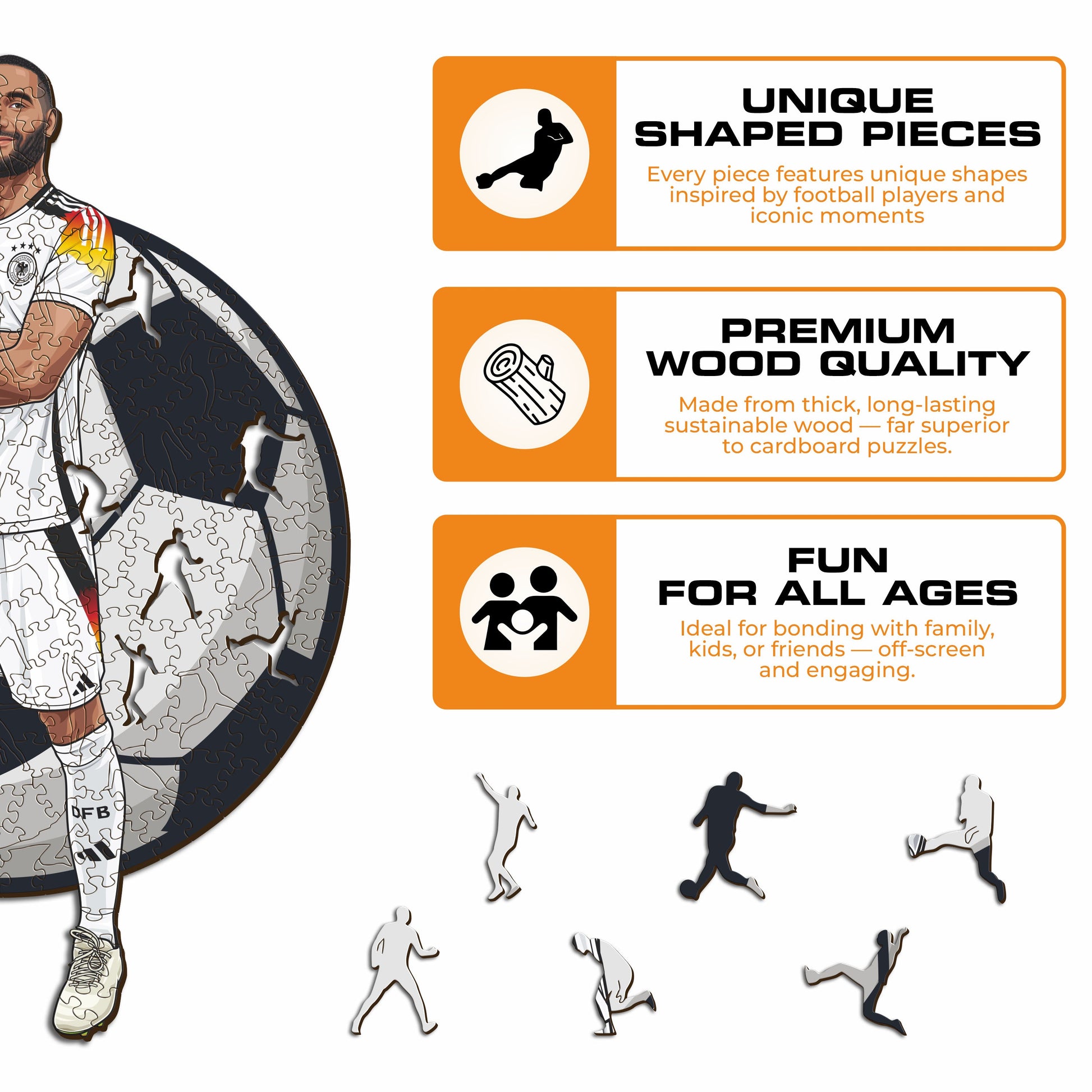 Each puzzle piece has a unique shape that depicts elements related to soccer and iconic player poses.