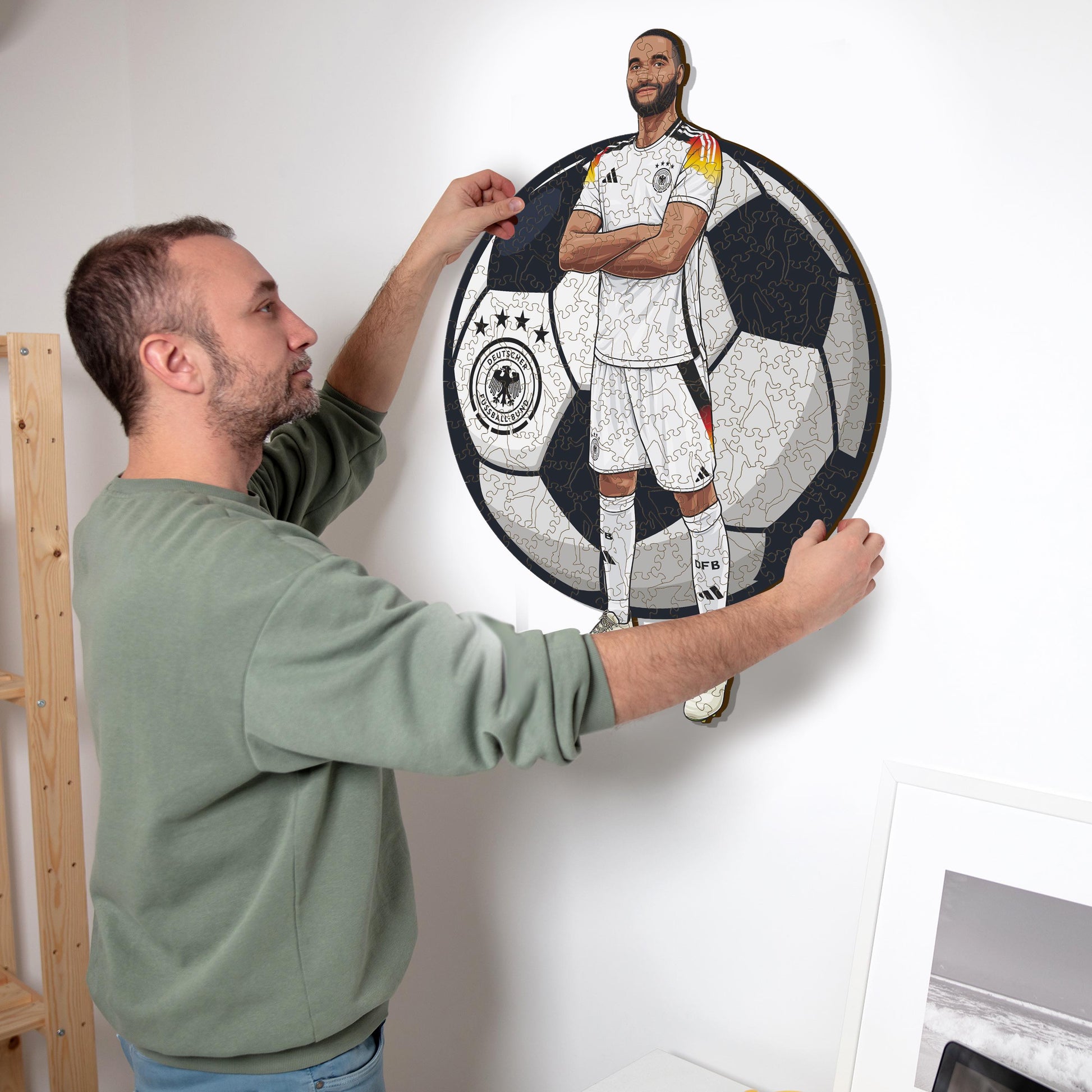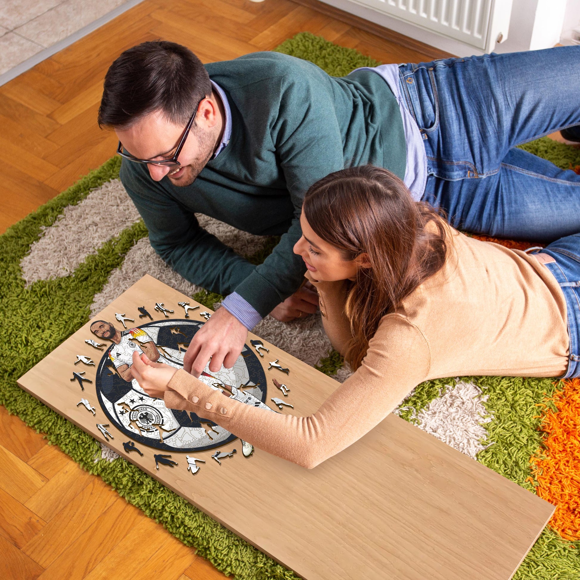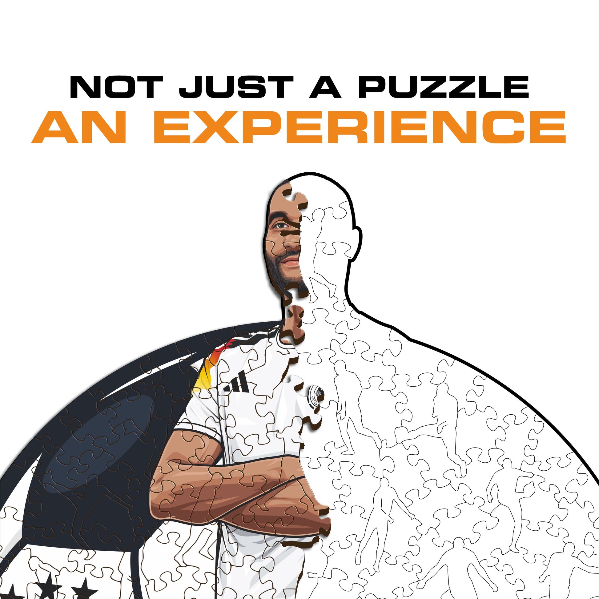 Each puzzle piece has a unique shape that depicts elements related to soccer and iconic player poses.