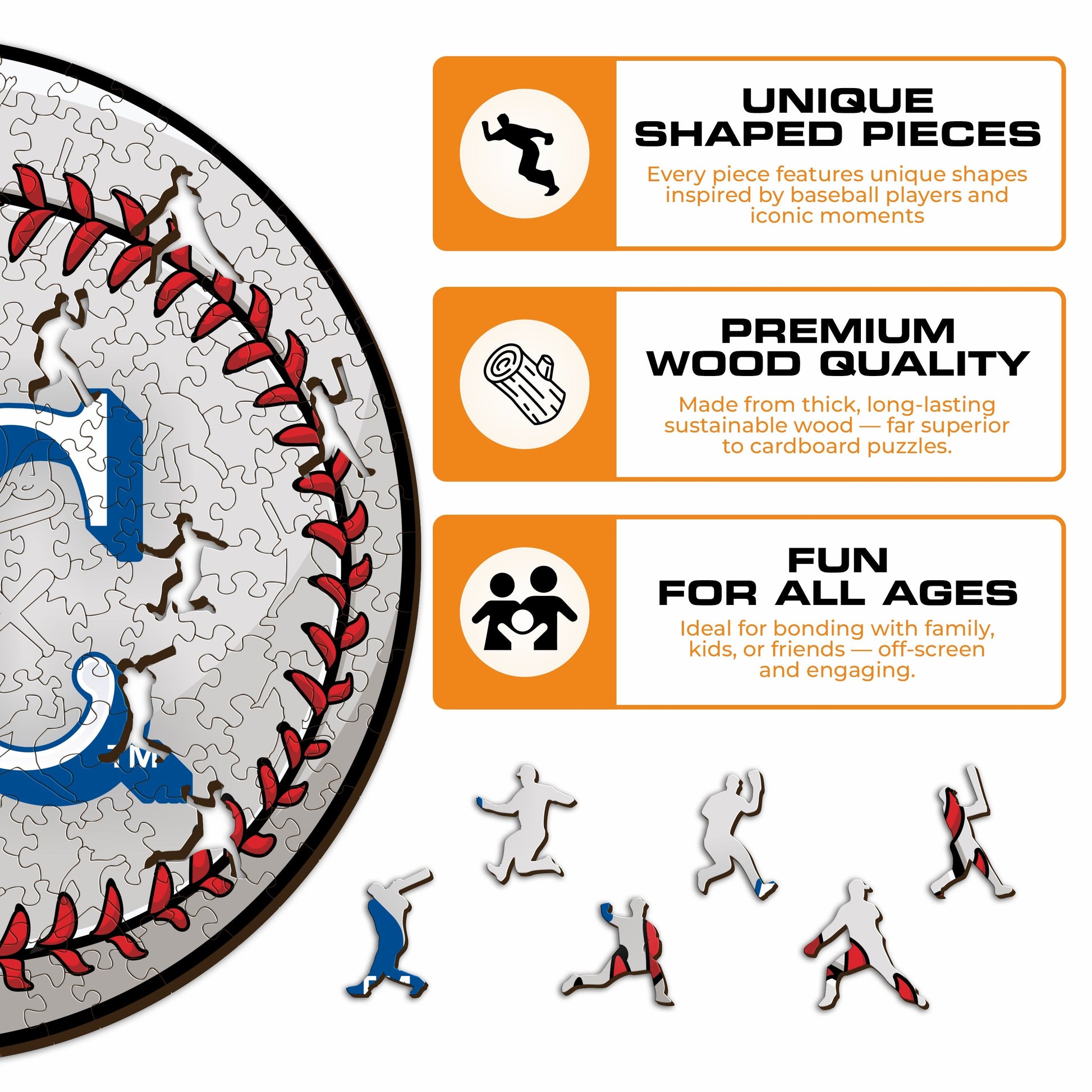 Each puzzle piece has a unique shape that depicts elements related to baseball and iconic player poses.