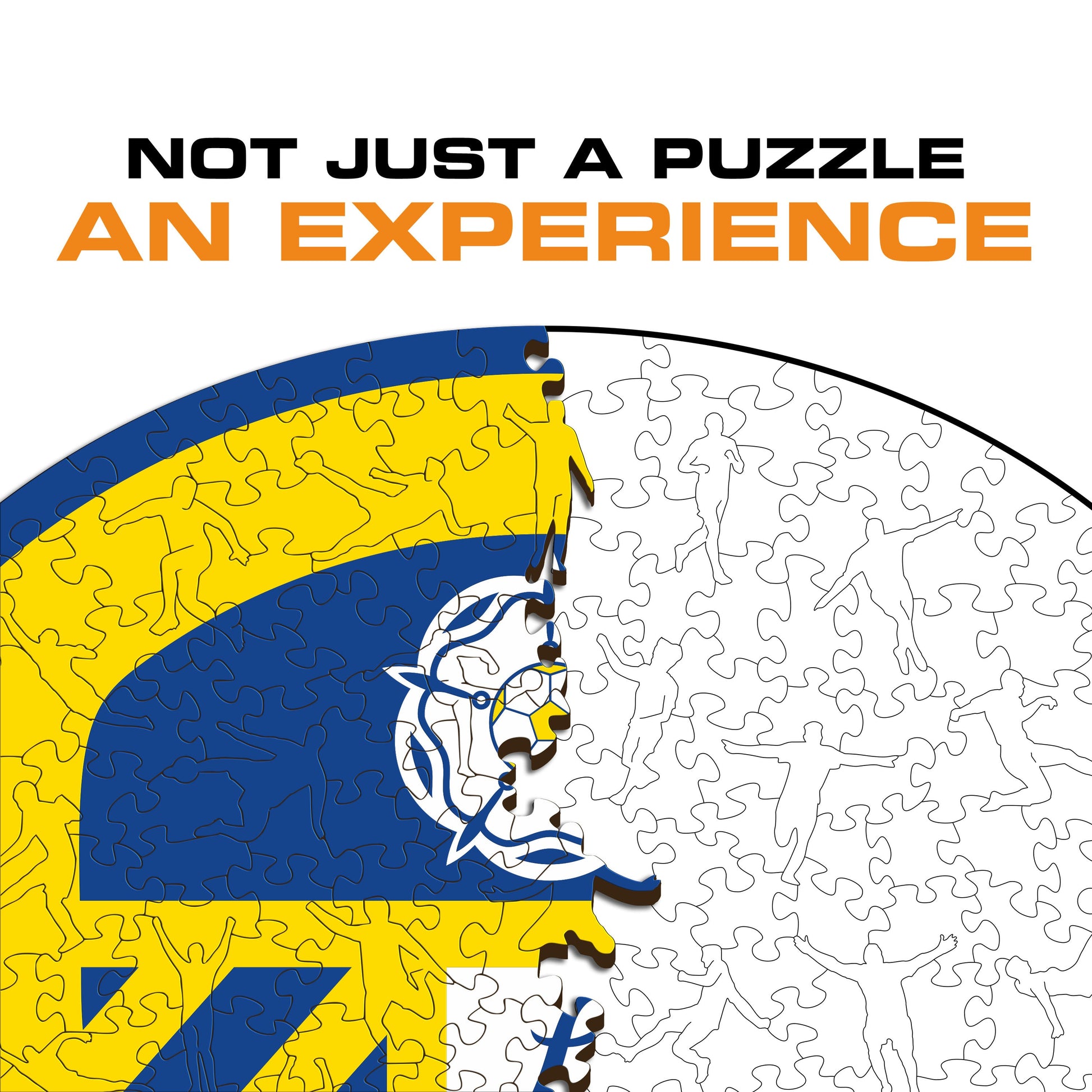 Each puzzle piece has a unique shape that depicts elements related to soccer and iconic player poses.
