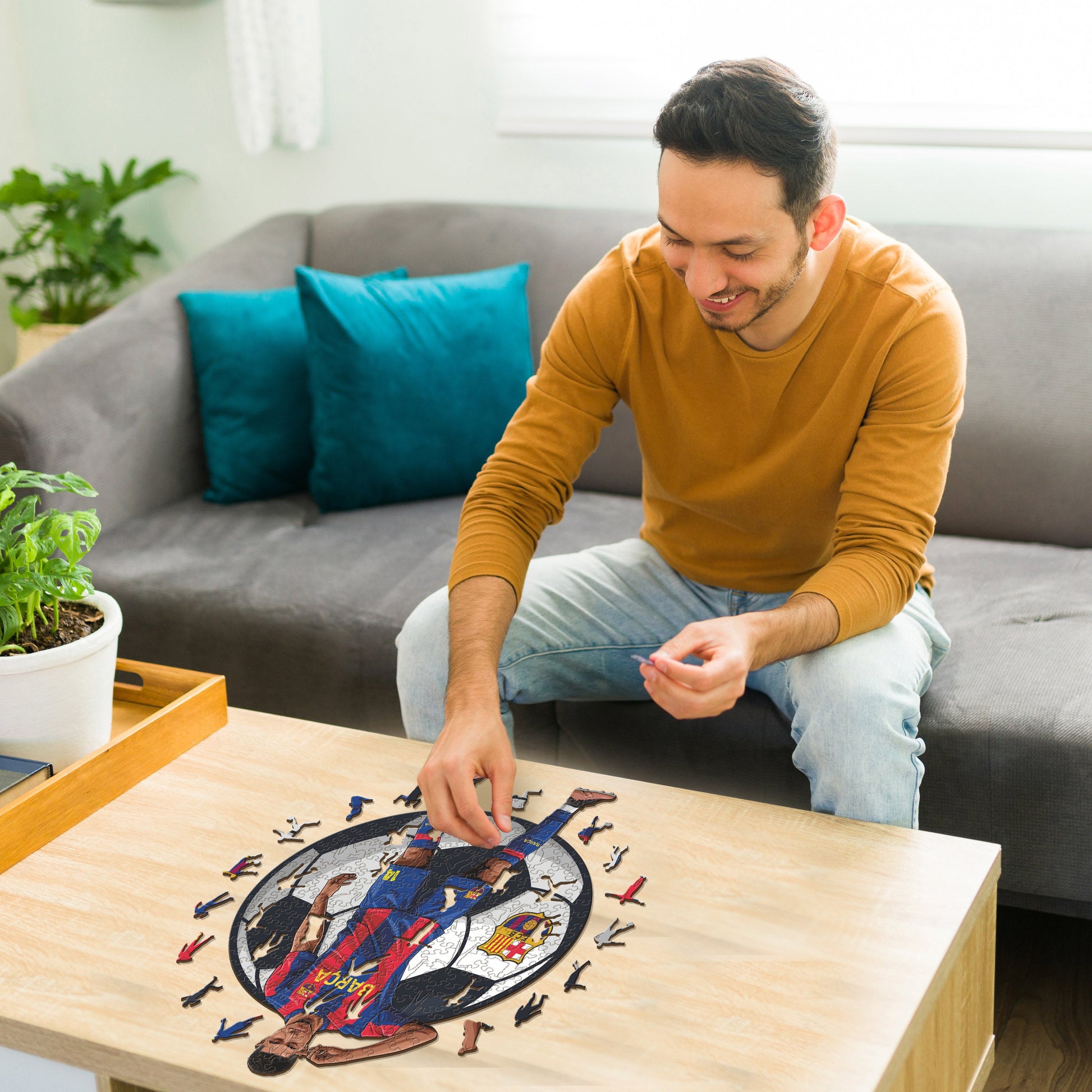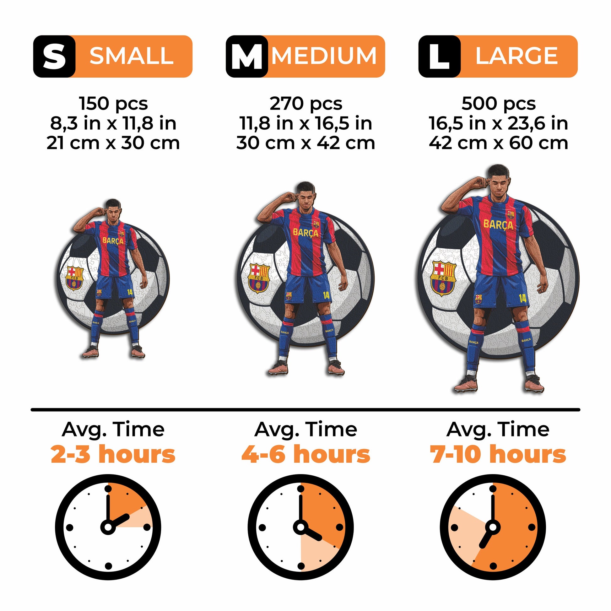 Each puzzle piece has a unique shape that depicts elements related to soccer and iconic player poses.