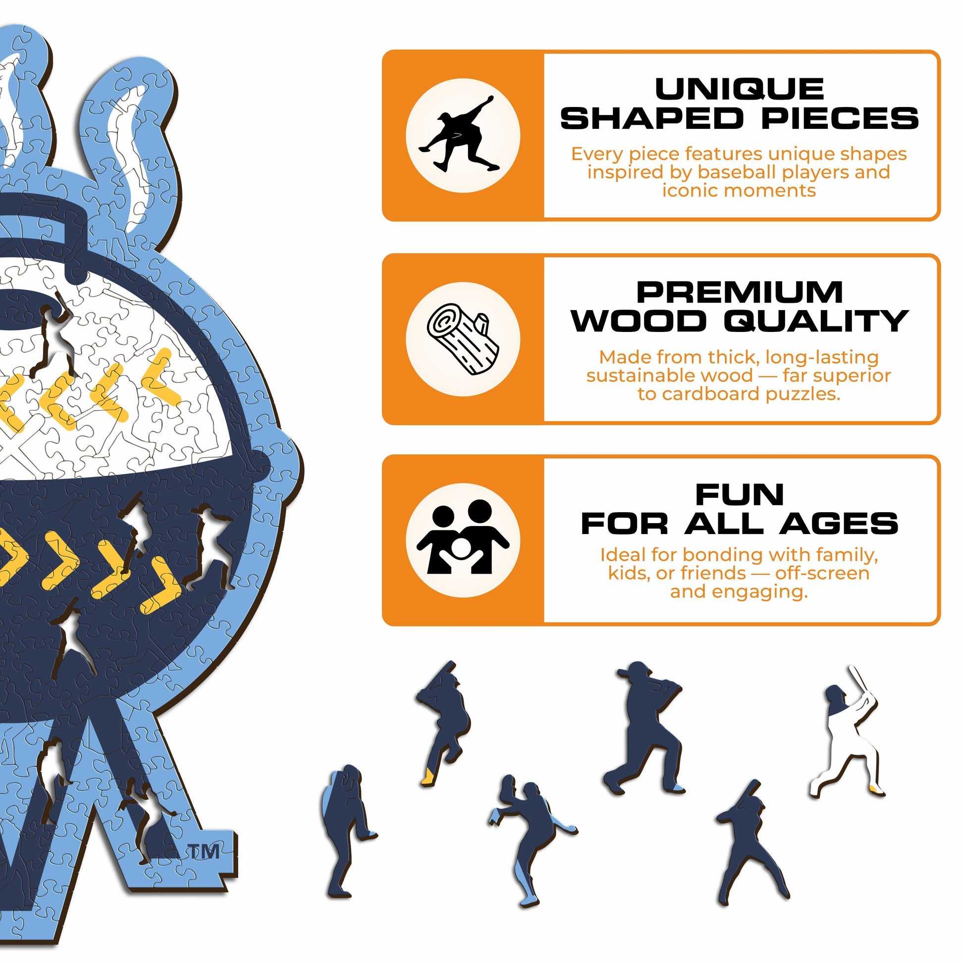 Each puzzle piece has a unique shape that depicts elements related to baseball and iconic player poses.