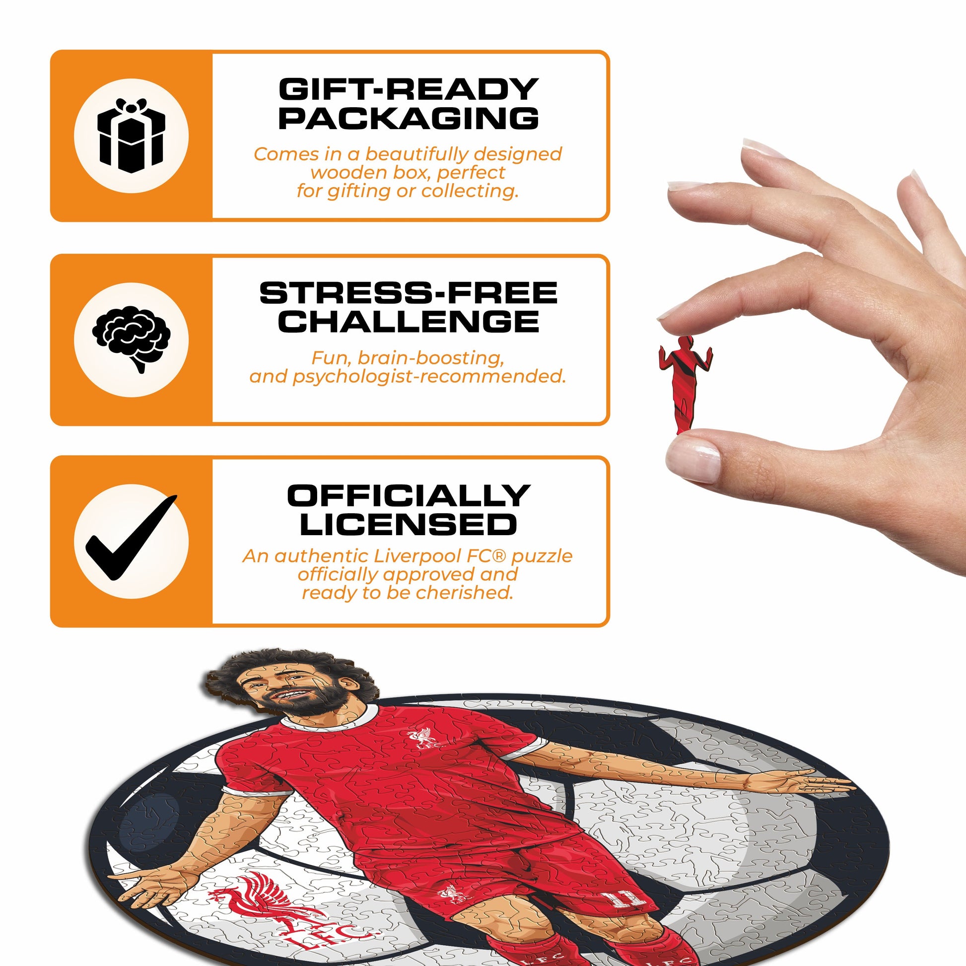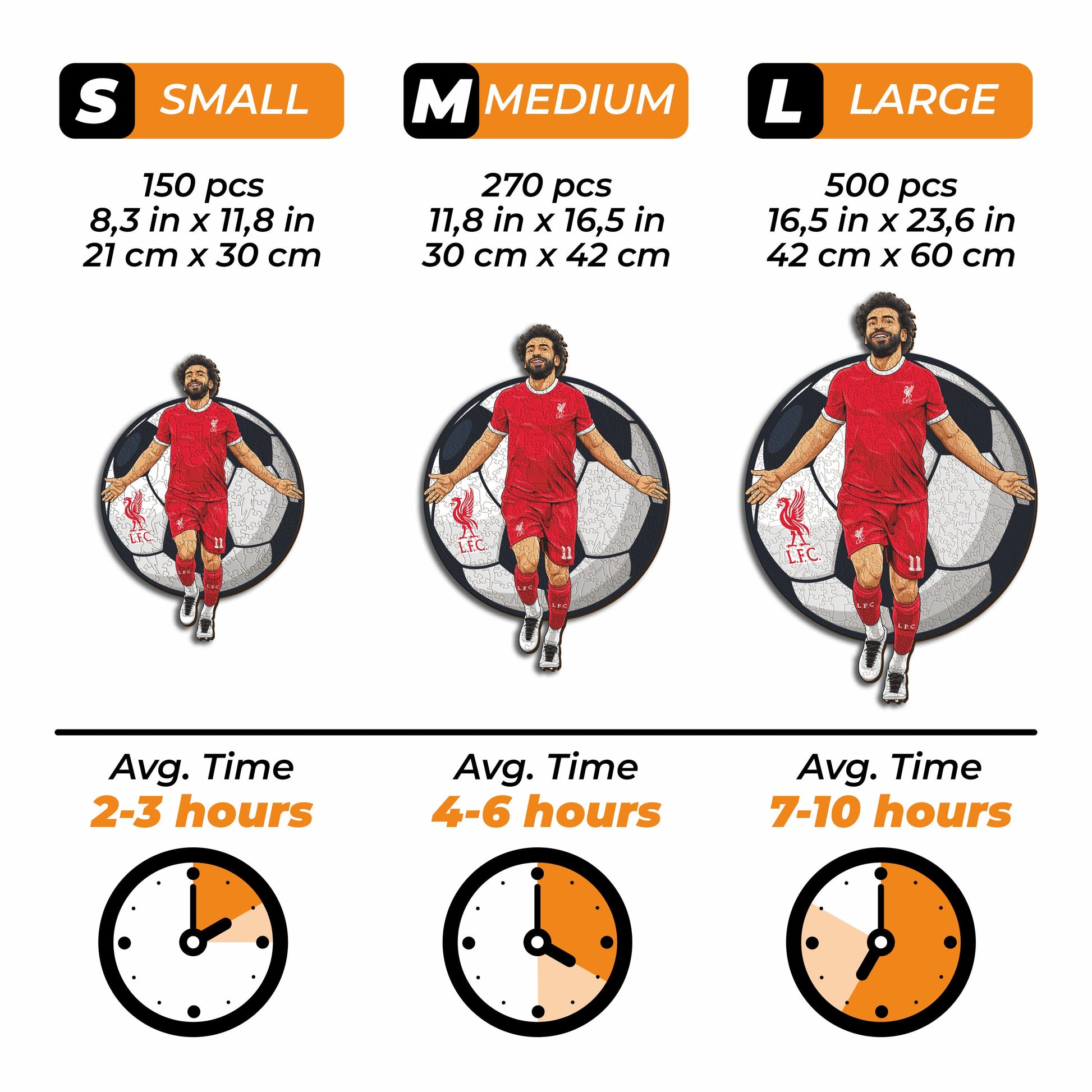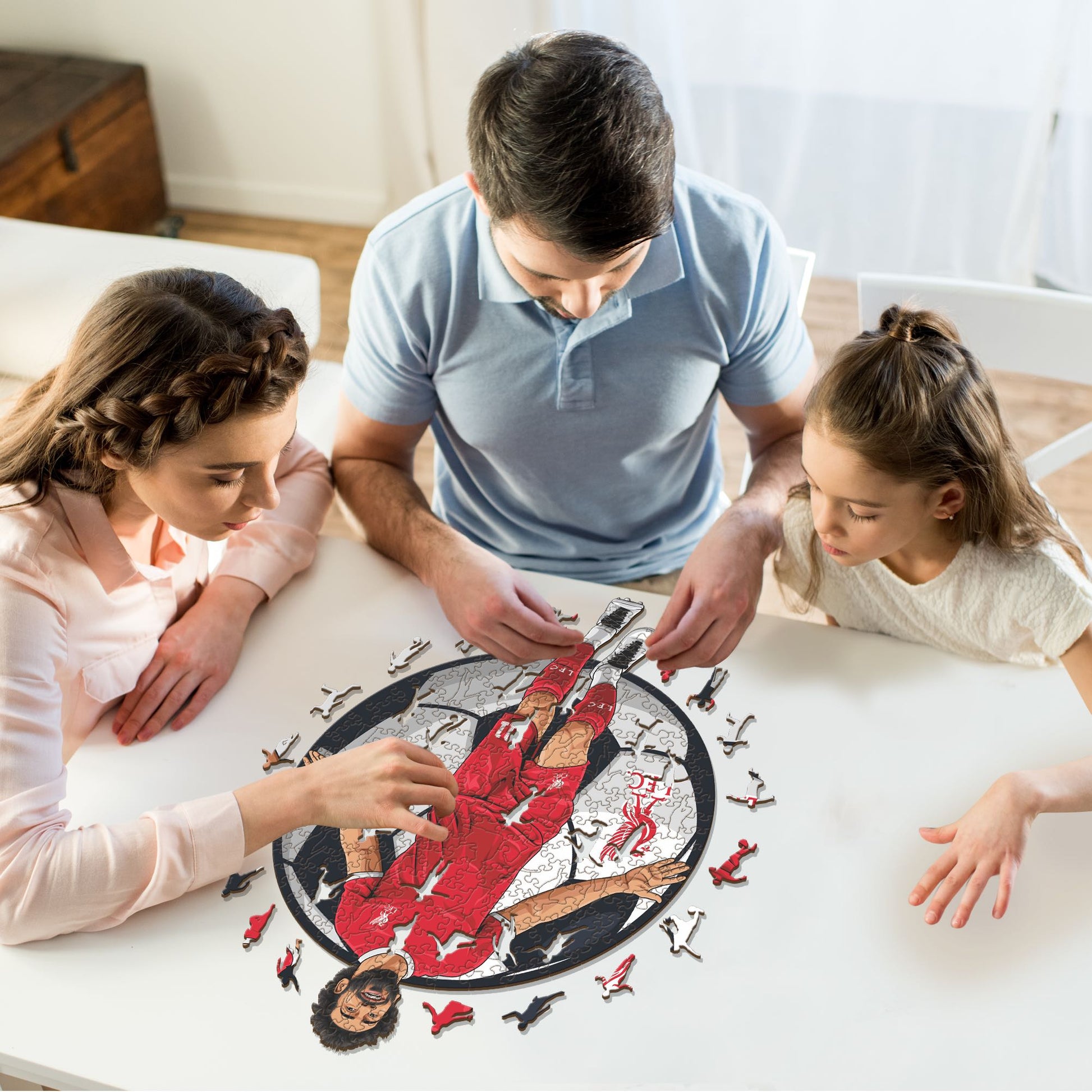 Each puzzle piece has a unique shape that depicts elements related to soccer and iconic players' poses.