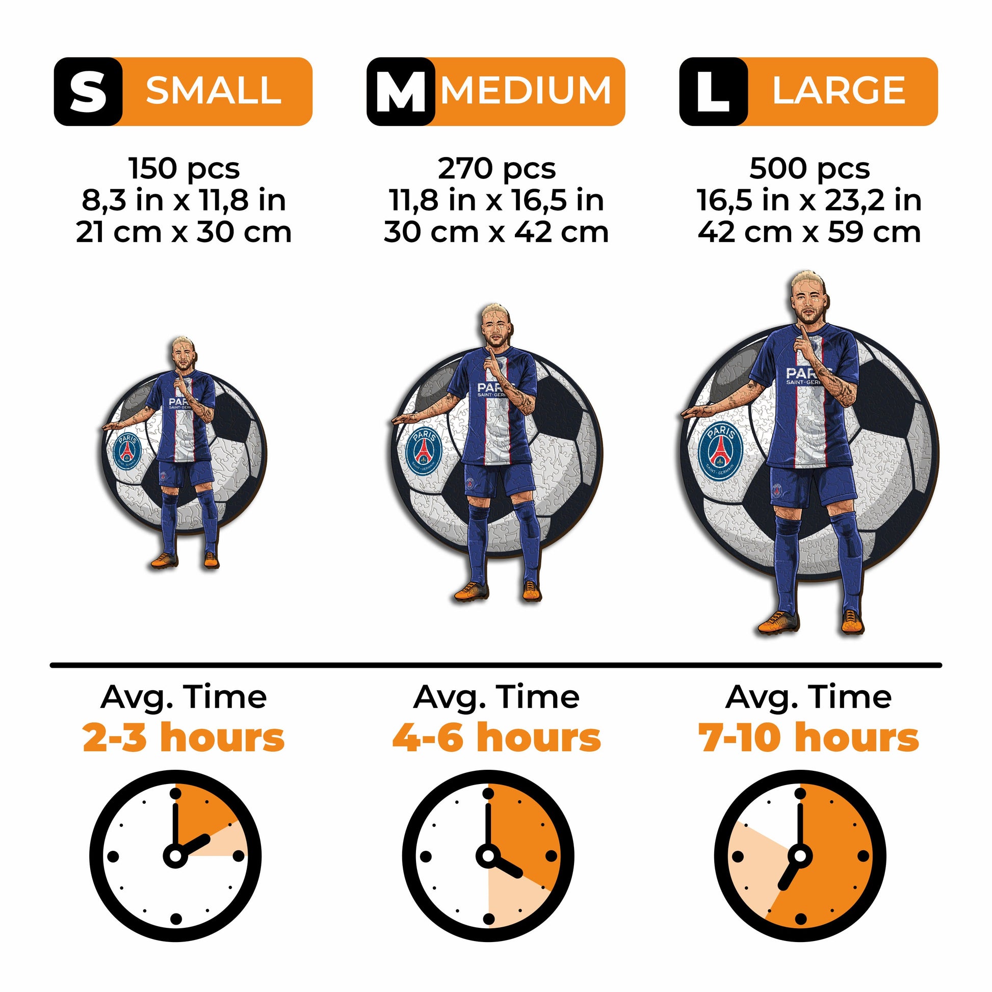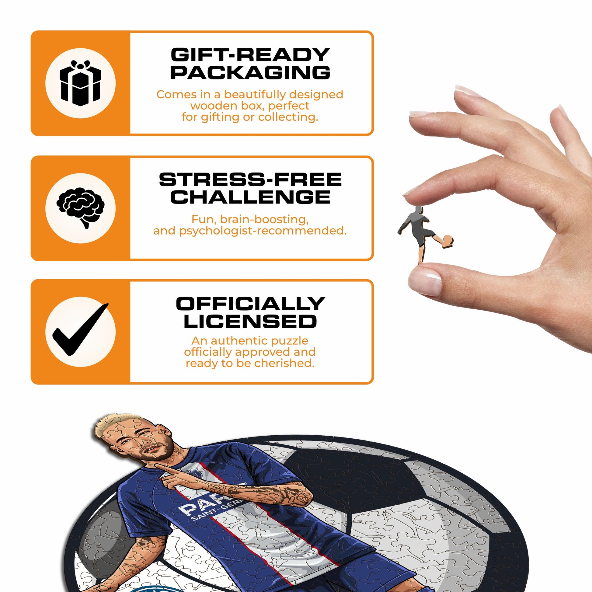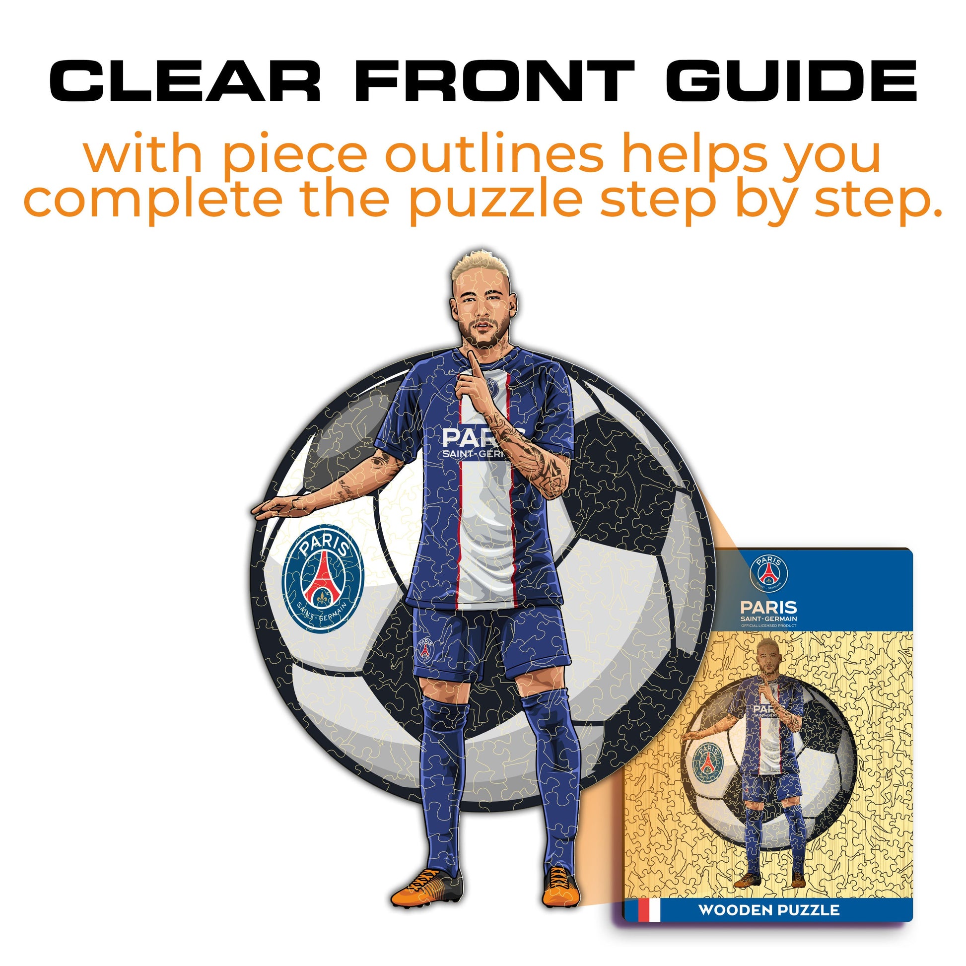 Each puzzle piece has a unique shape that depicts elements related to soccer and iconic player poses.