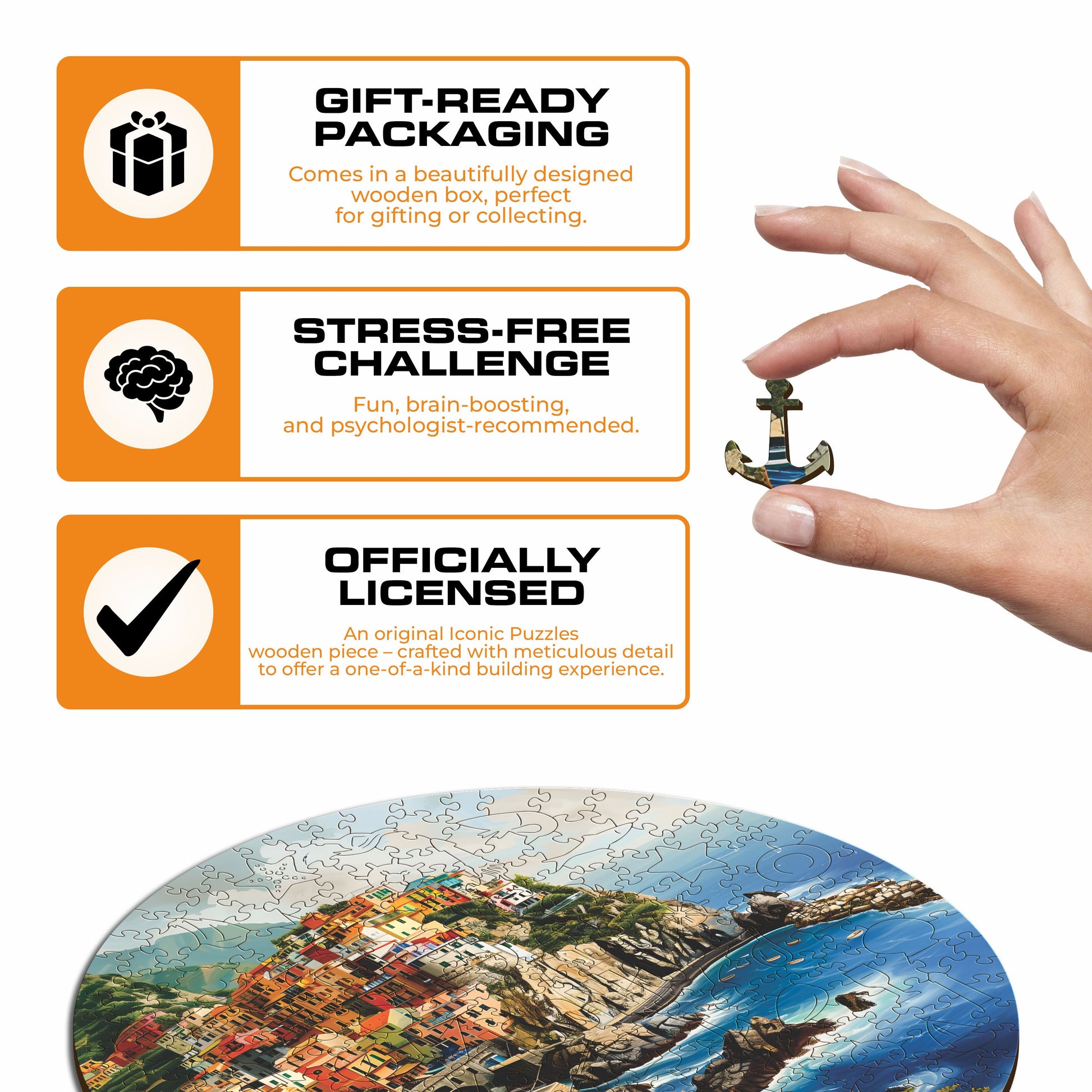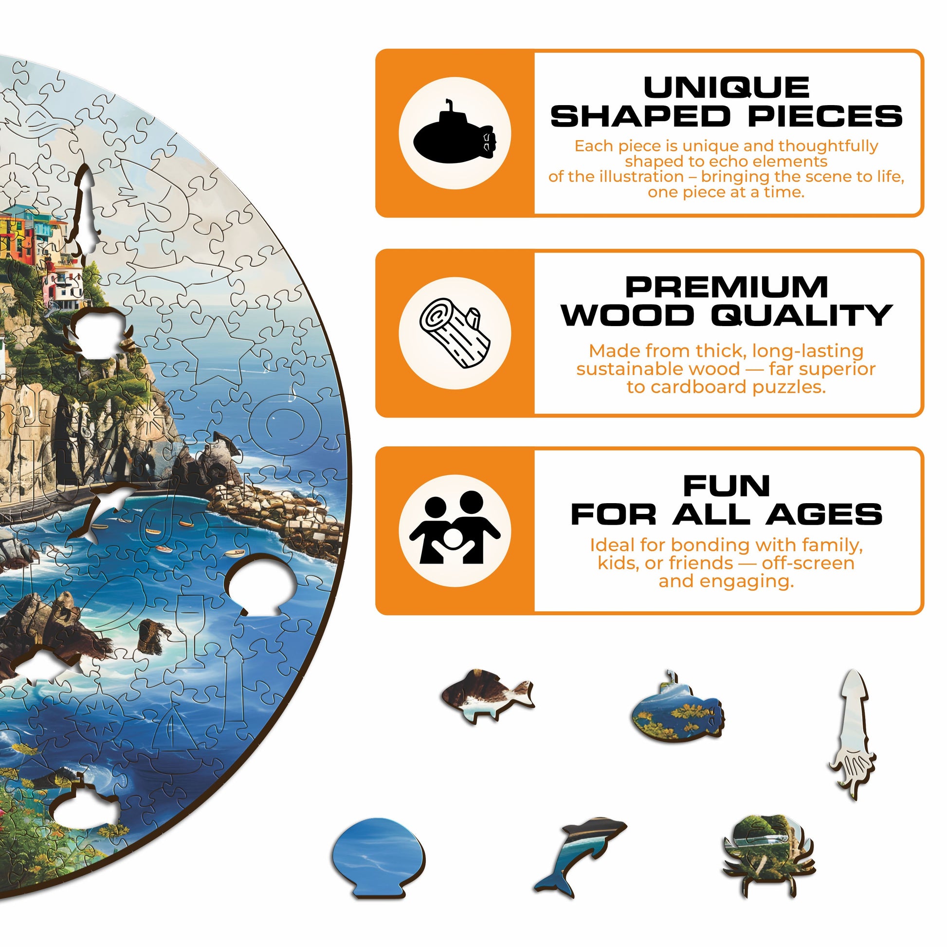 Each puzzle piece has a unique shape that depicts elements related to Italy and sea elements.