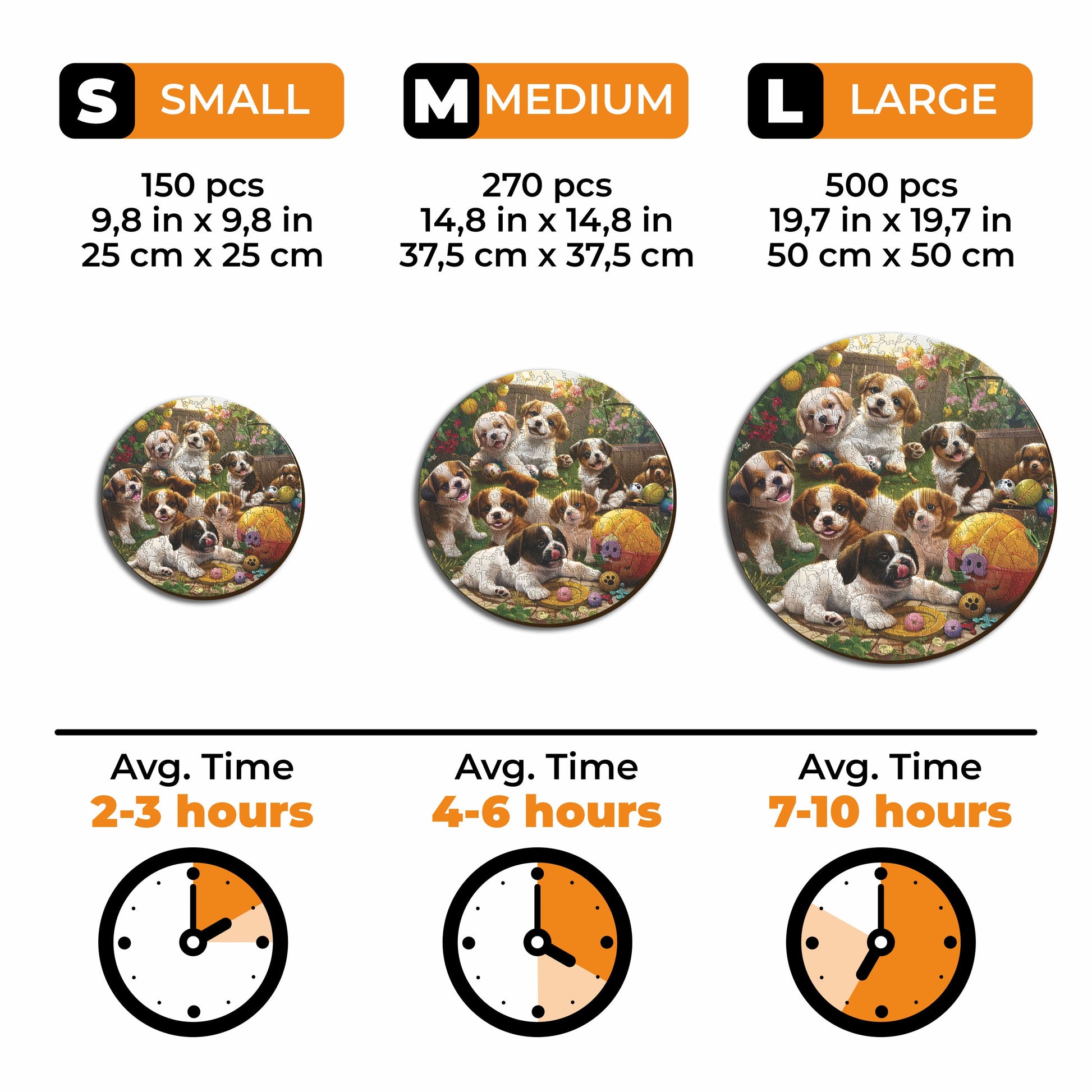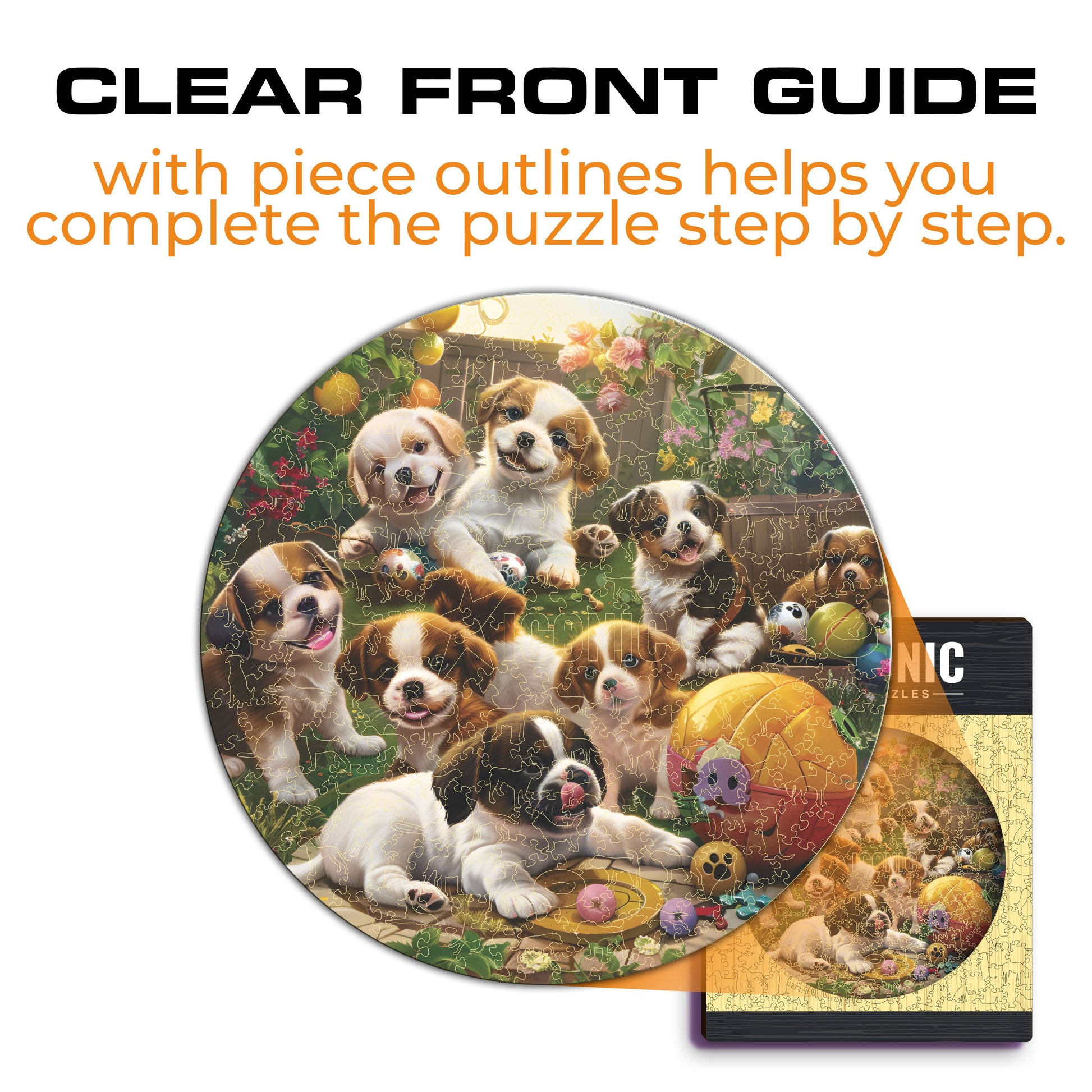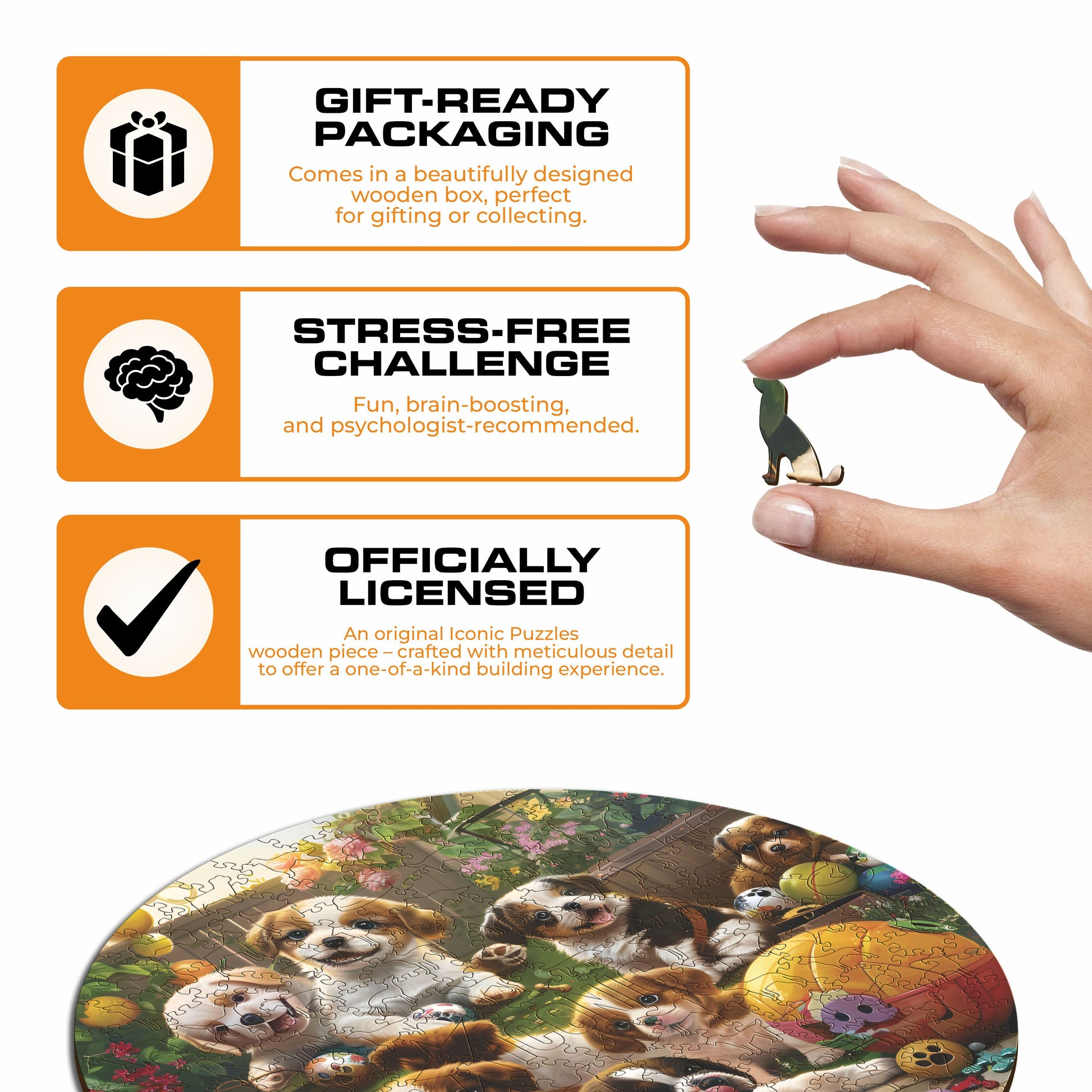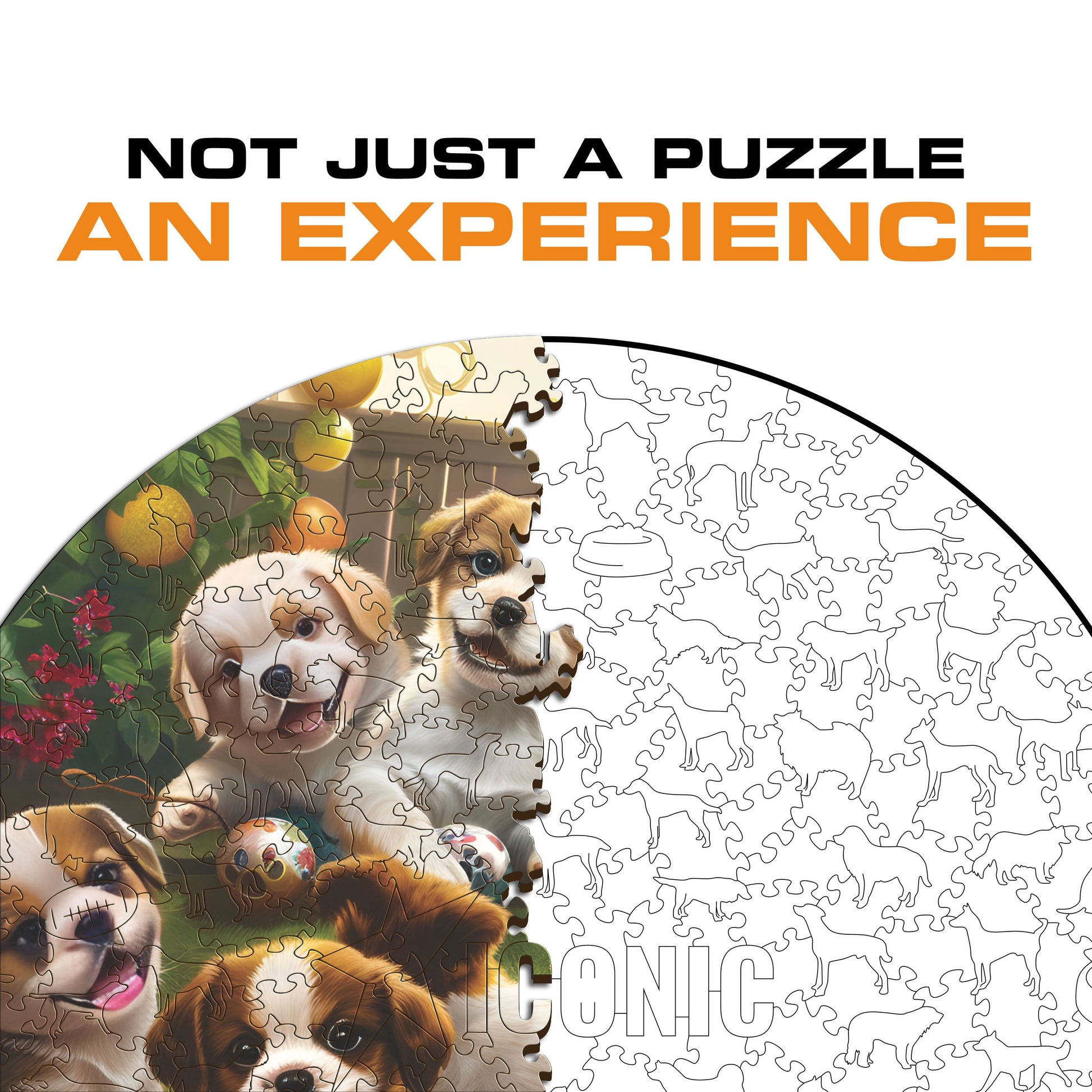 Each puzzle piece has a unique shape that depicts elements related to puppies and dogs.