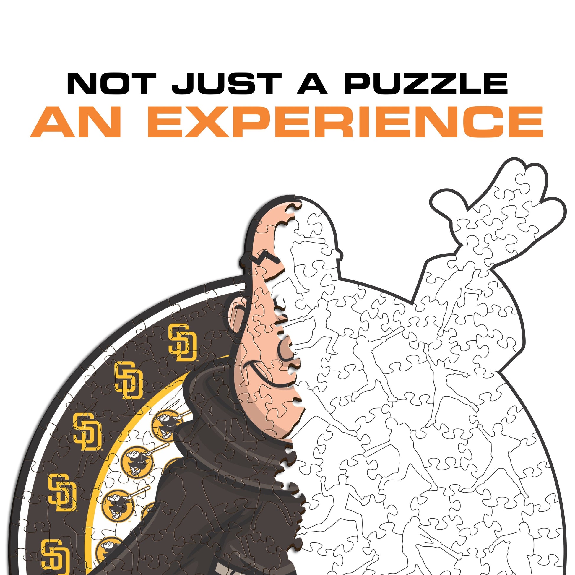 Each puzzle piece has a unique shape that depicts elements related to baseball and iconic players' poses.