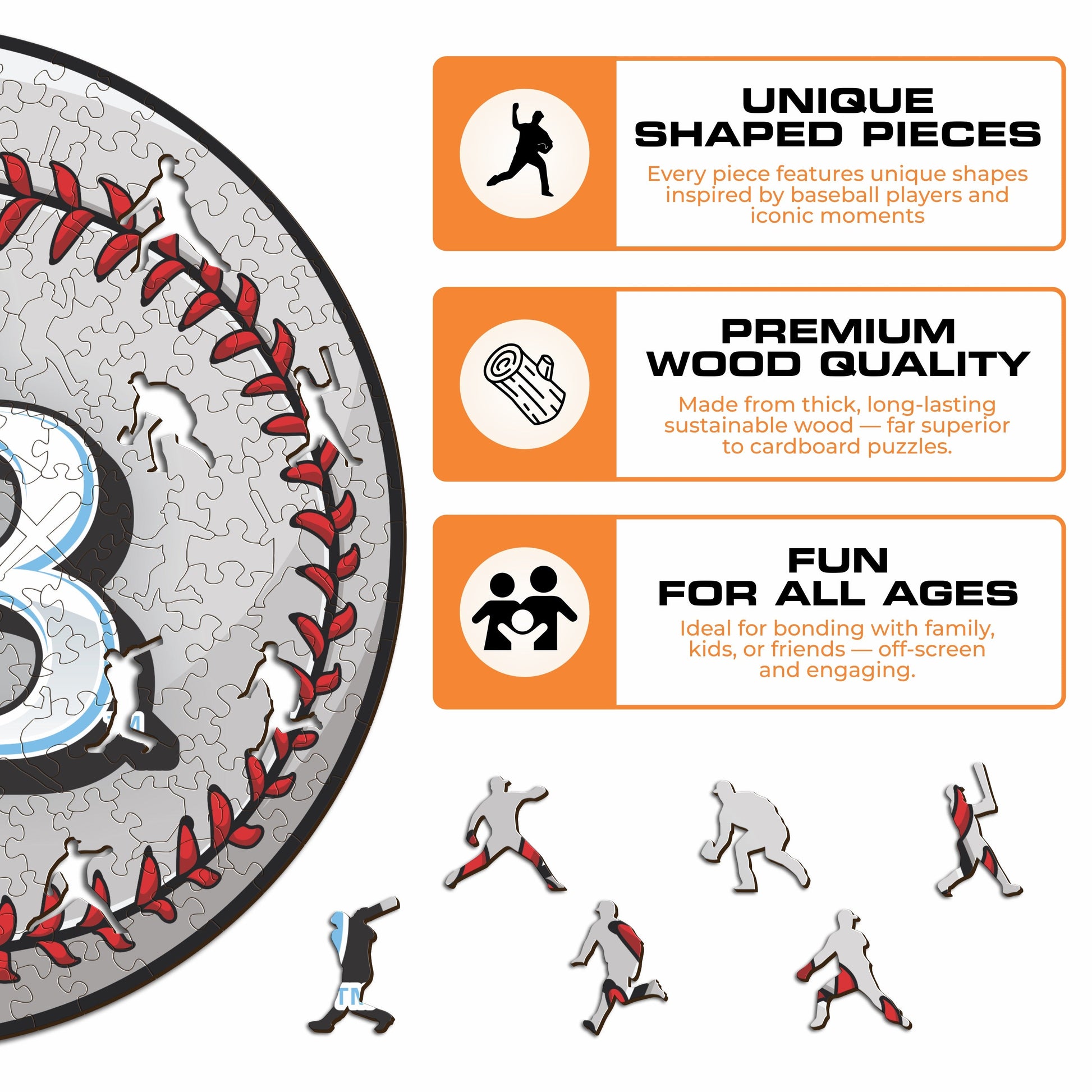 Each puzzle piece has a unique shape that depicts elements related to baseball and iconic player poses.