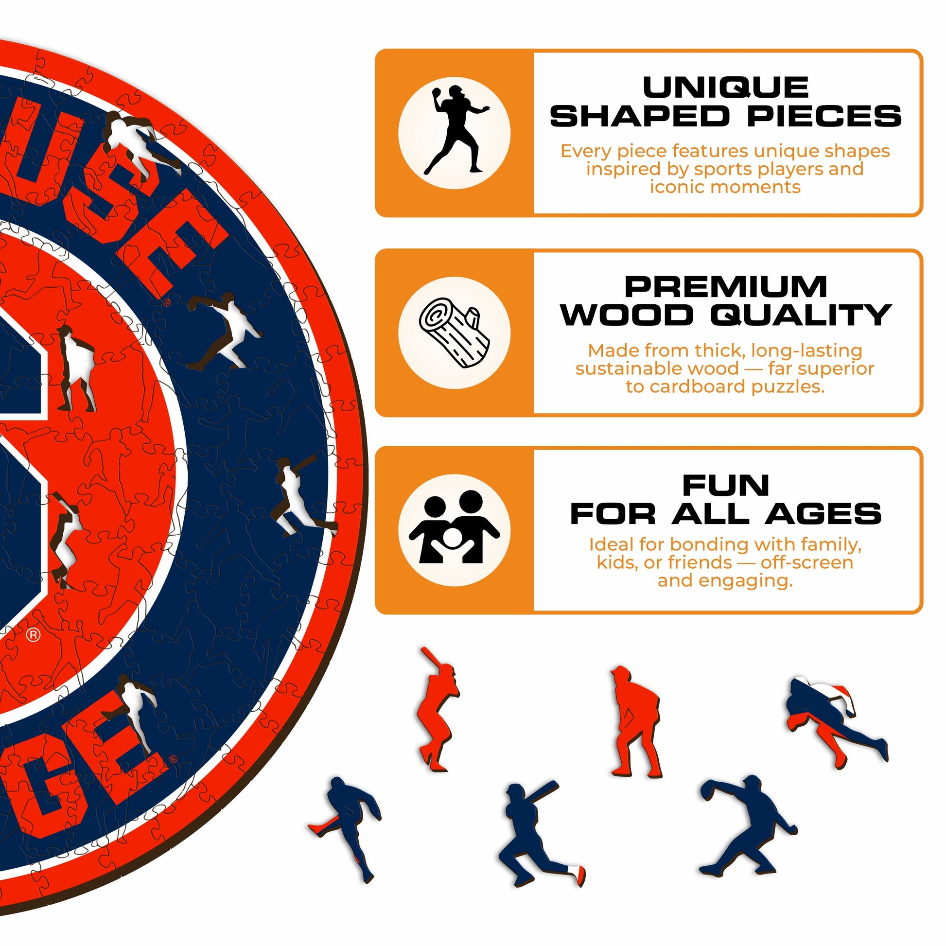 Each puzzle piece has a unique shape that depicts elements related to sports and iconic player poses.