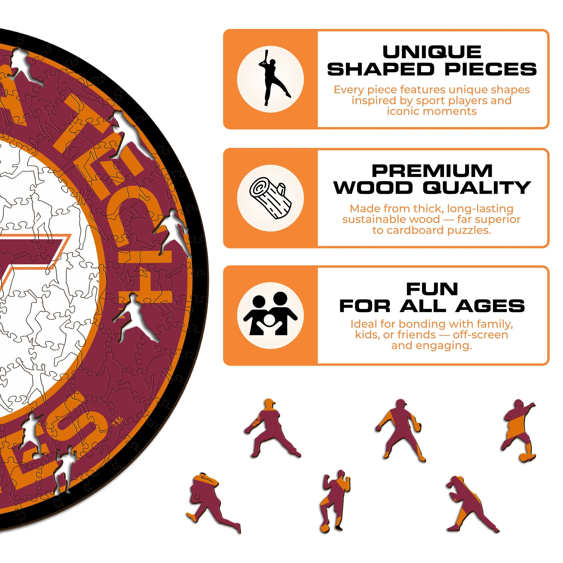 Each puzzle piece has a unique shape that depicts elements related to sports and iconic player poses.