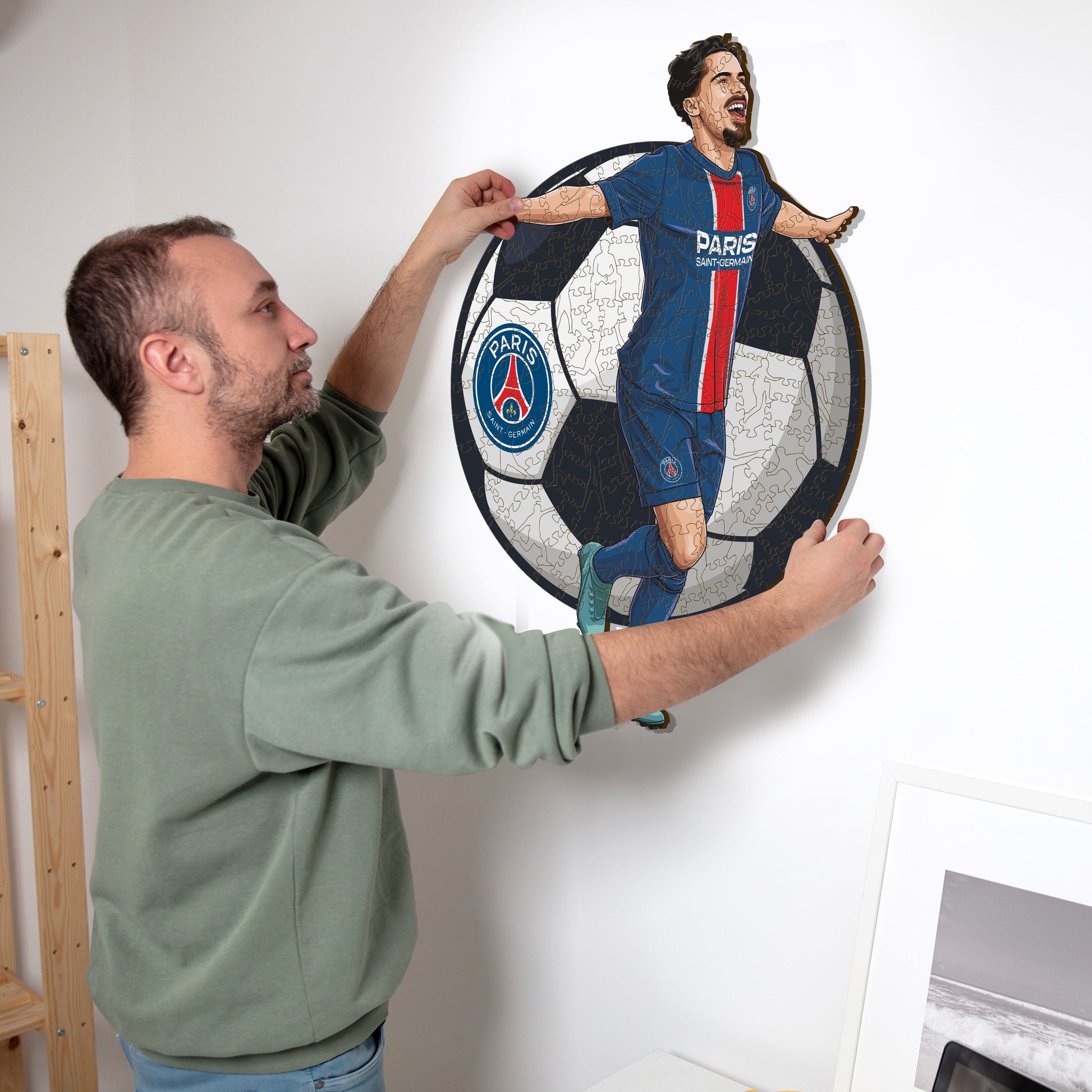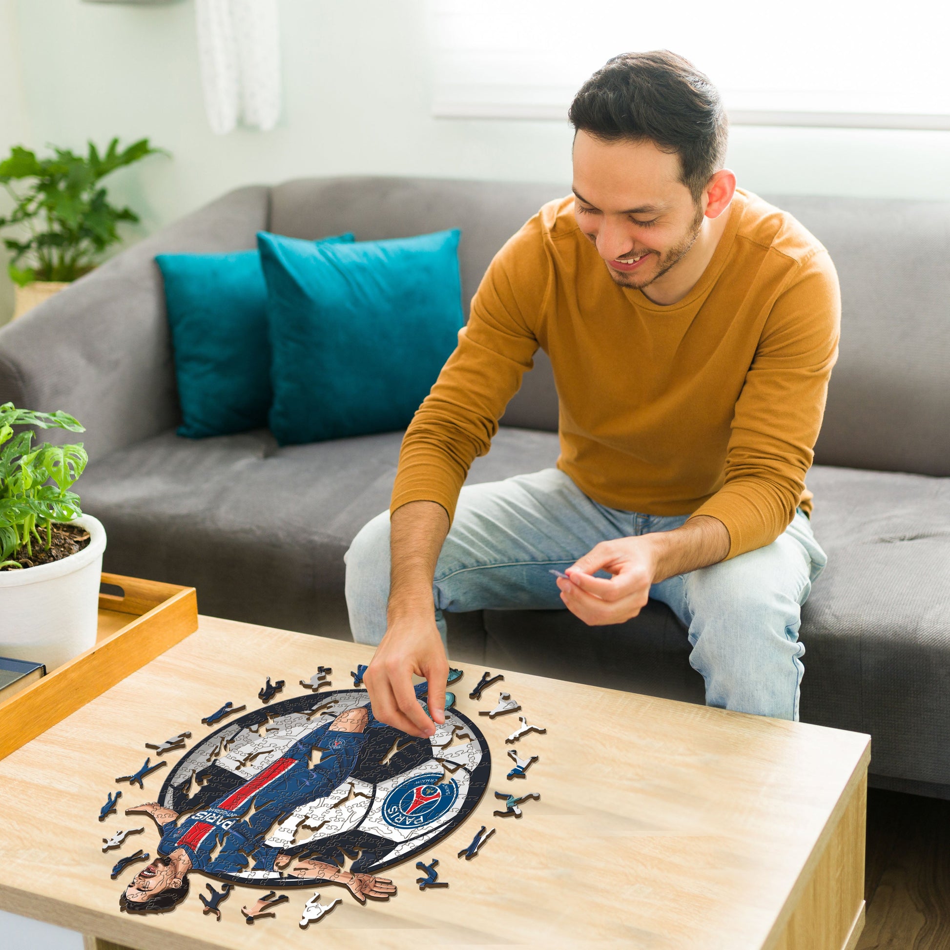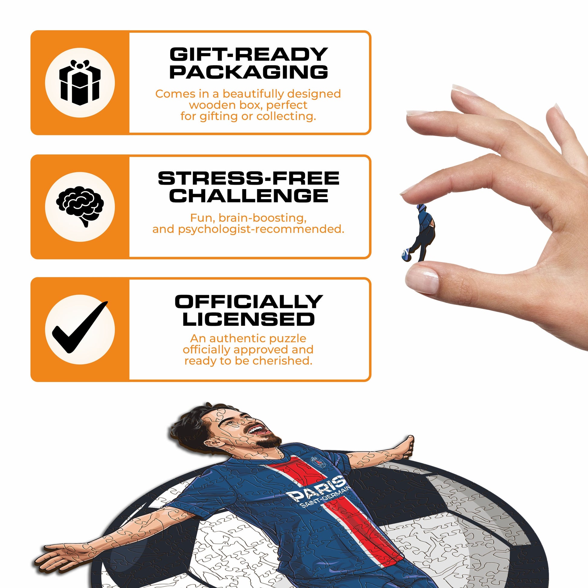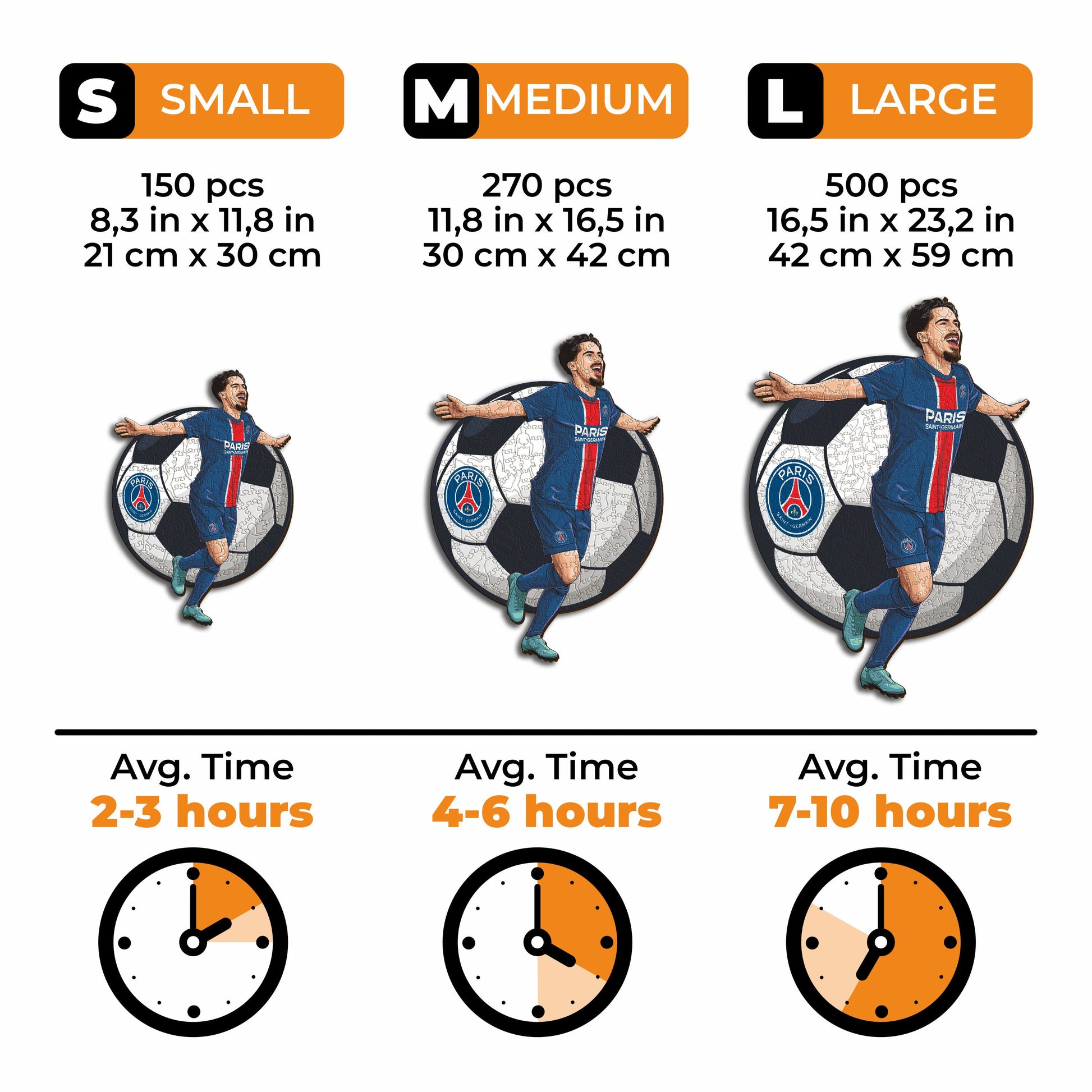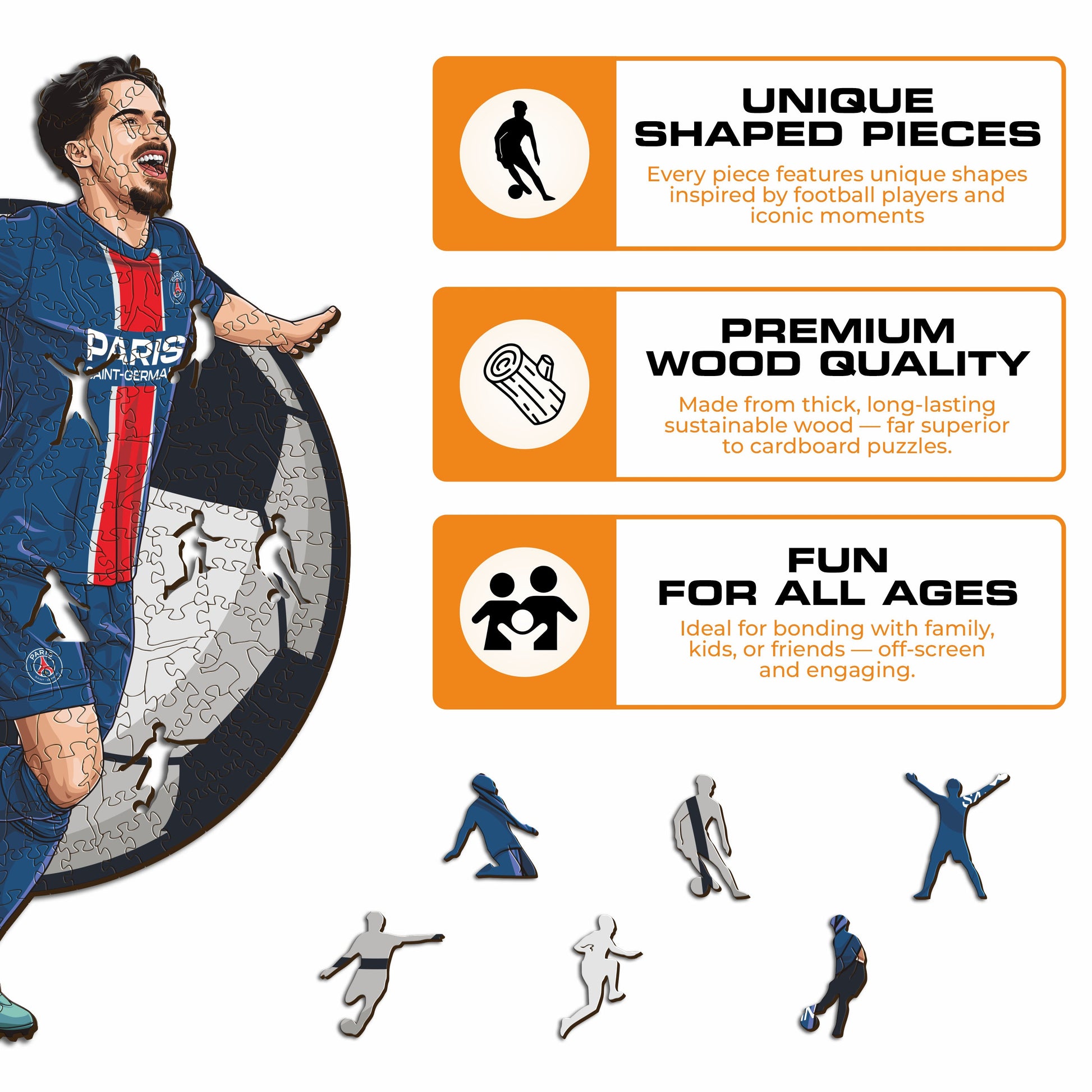 Each puzzle piece has a unique shape that depicts elements related to soccer and iconic player poses.